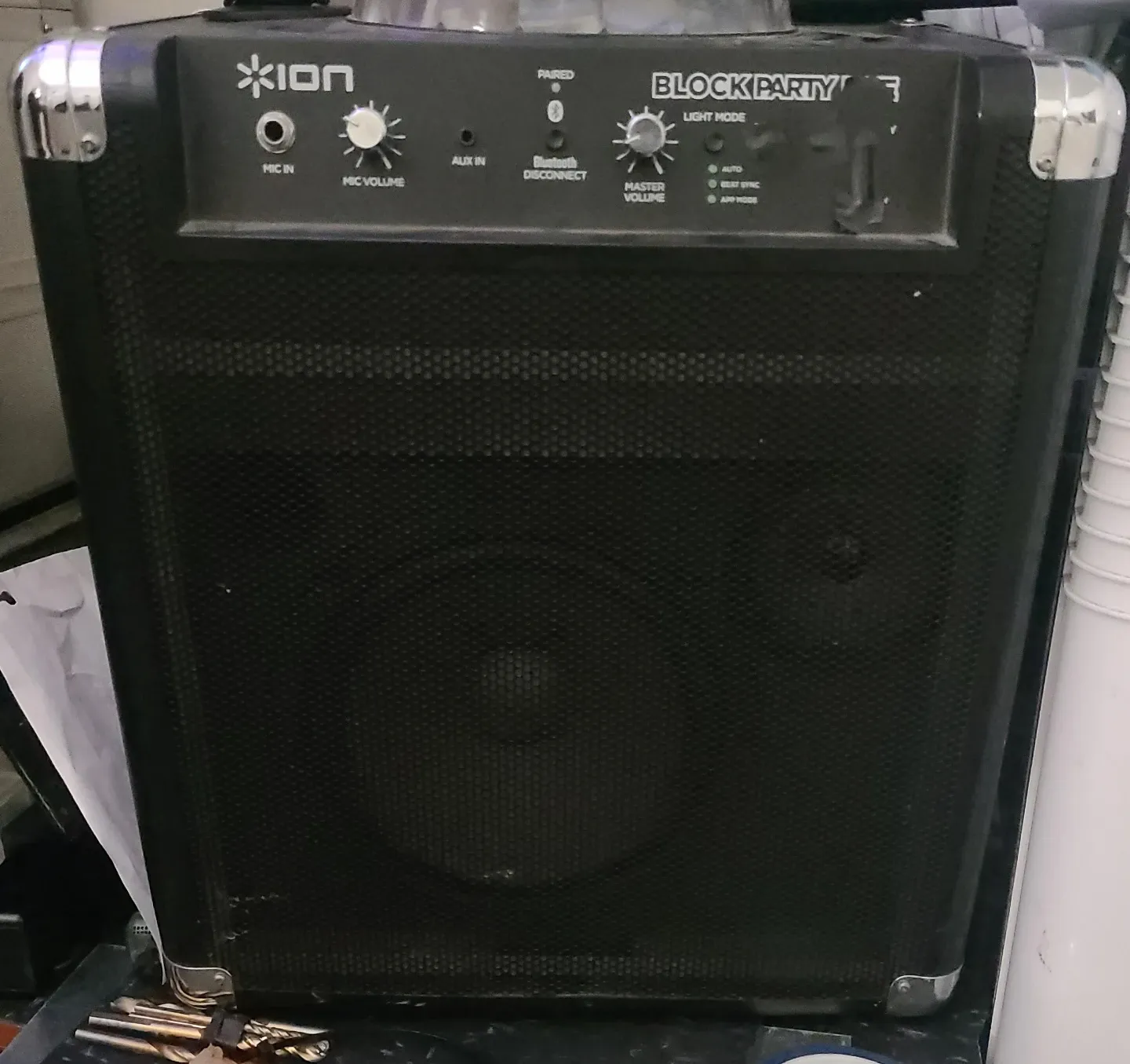 This ION Block Party is a portable speaker with Bluetooth connectivity. It features mic and aux inputs for versatile audio options. The speaker also has adjustable master volume and light modes.