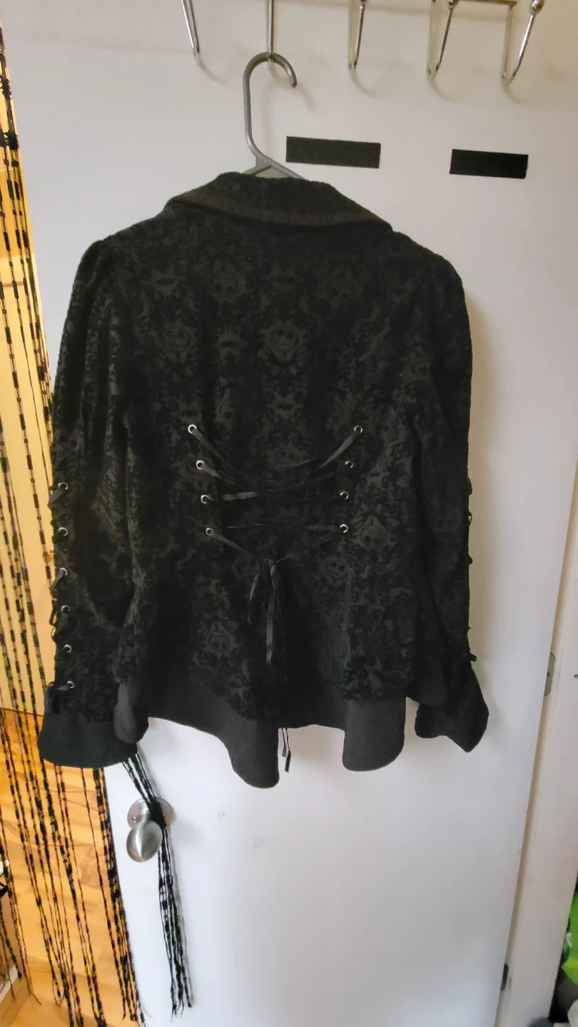 This black velvet jacket features a subtle Jack Skellington pattern throughout. It has a lace-up detail on the sleeves and back. Great for a unique gothic or Halloween-themed look!