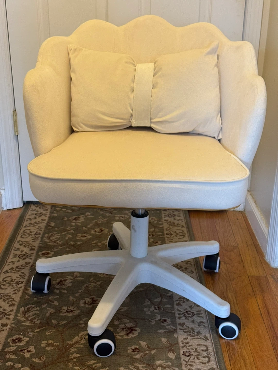 This accent chair features a unique shell-shaped design and comes with two decorative pillows. It's upholstered in a soft white fabric and includes rolling casters for easy mobility. Its swivel base allows for 360-degree rotation.