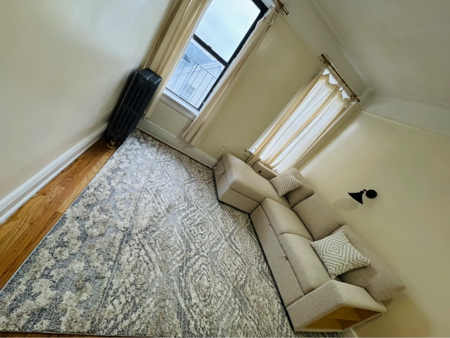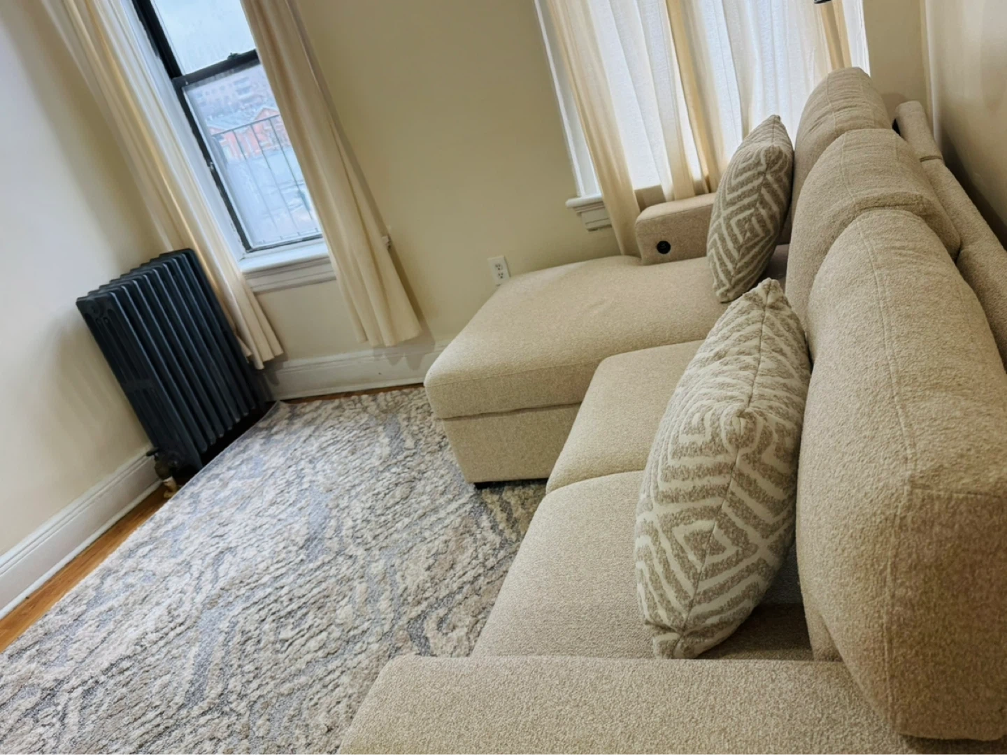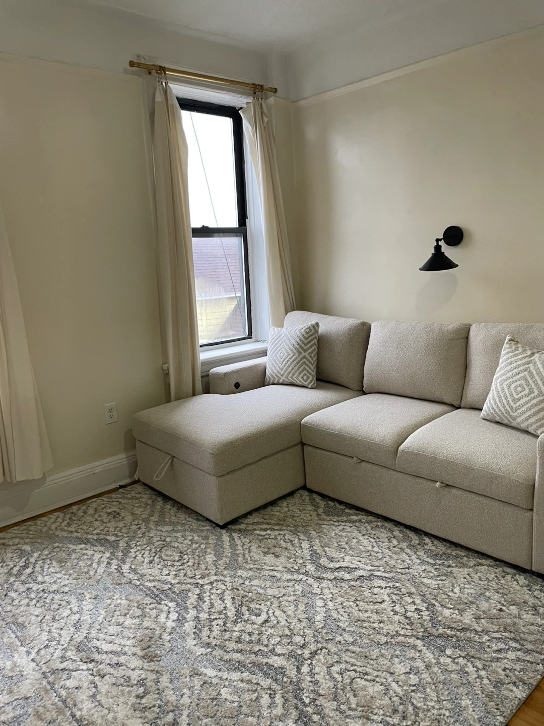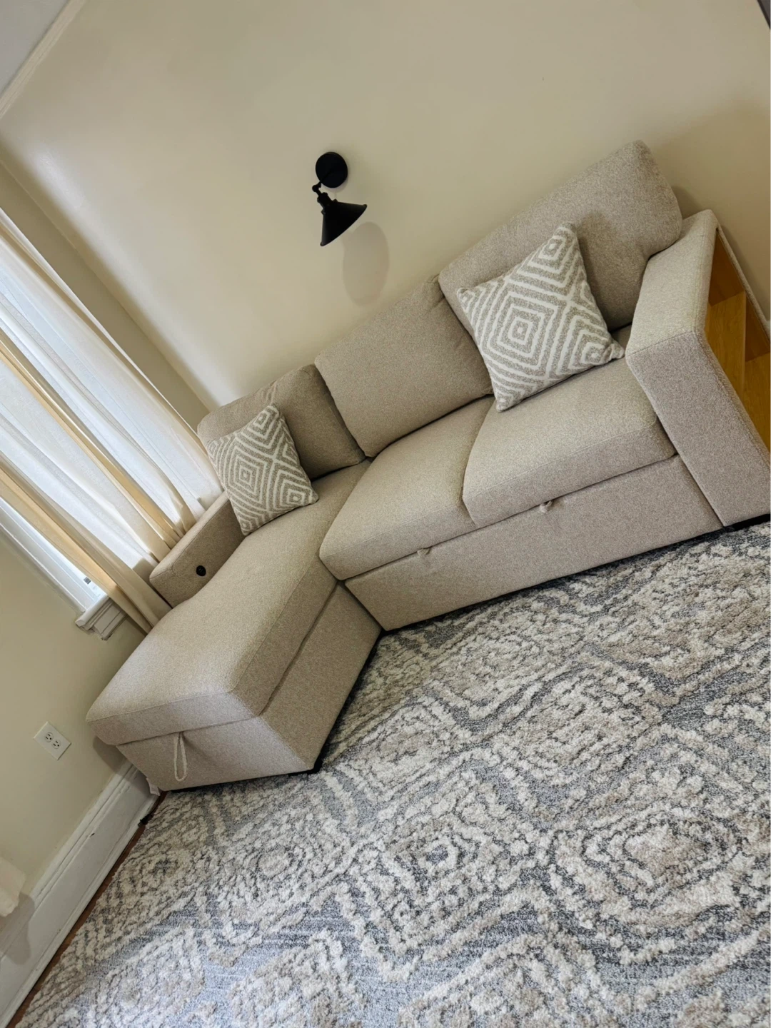This is a light beige sectional sofa. It comes with two decorative pillows. The ottoman has built-in storage, perfect for blankets or extra pillows!