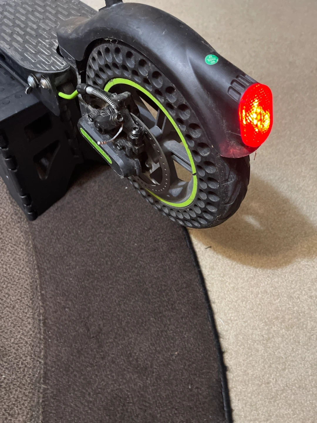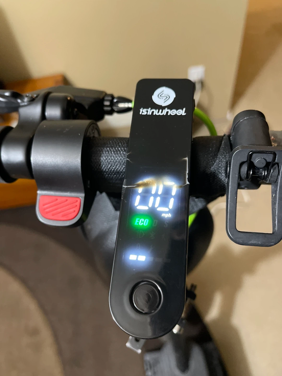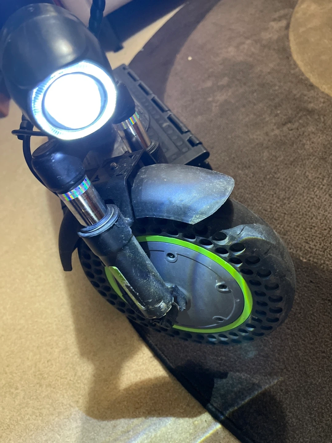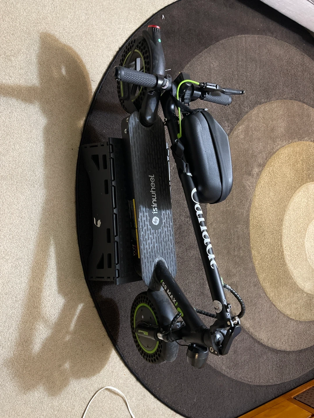 This isinwheel electric scooter is in good working condition. It features a digital display for speed and battery life, a rear brake light and front light . The scooter also comes with a handlebar storage bag and charger.