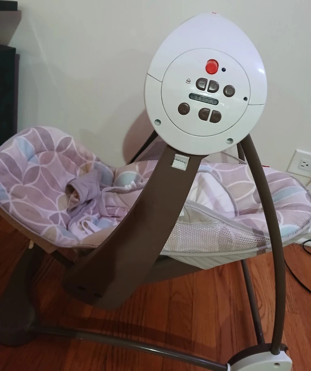This Fisher-Price baby swing features a comfortable seat with a patterned fabric. It has multiple buttons on the control panel. It's suitable for infants.