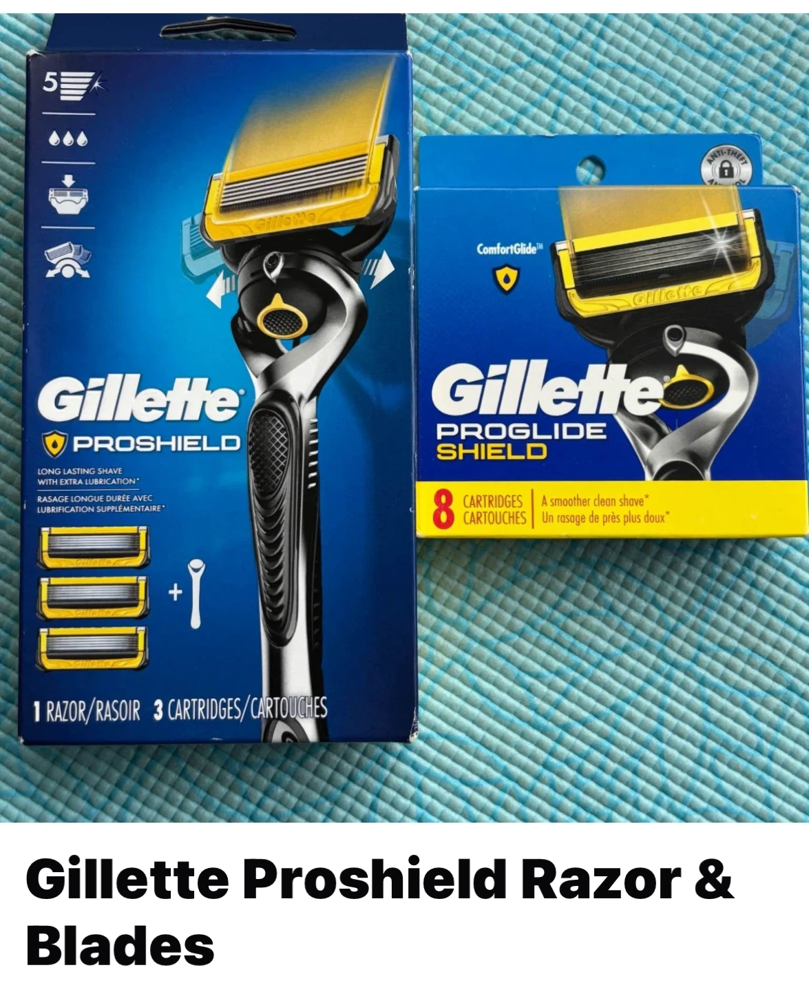 Gillette Proshield razor with ComfortGlide technology. Includes 1 razor and 3 cartridges for a smooth, long-lasting shave. Extra lubrication included. Also 8pk cartridges. Made in USA.