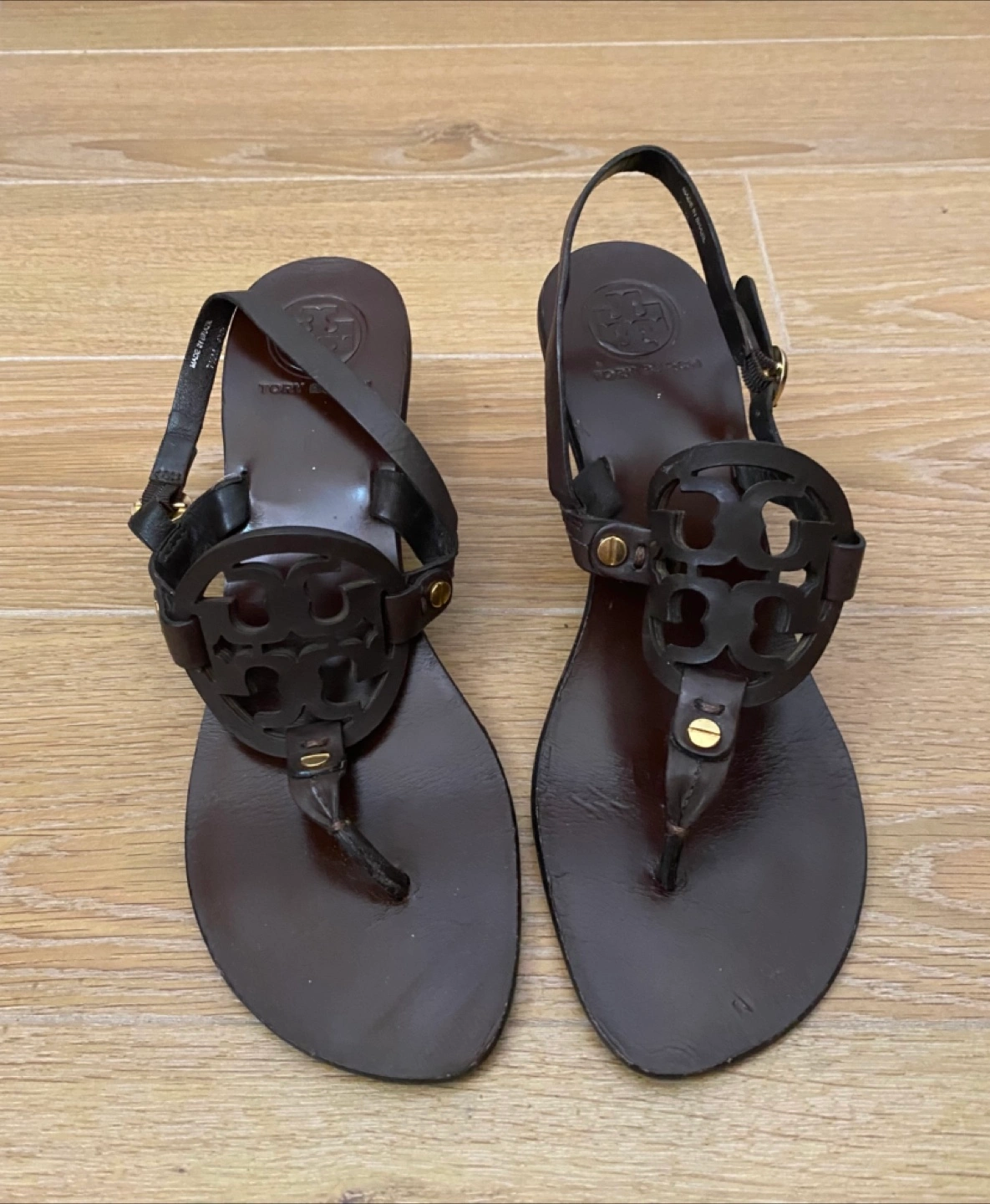 These are a pair of Tory Burch heels in size 7.5M. They are a dark brown colour and feature the classic Tory Burch logo. They're in good condition, ready for a new home!