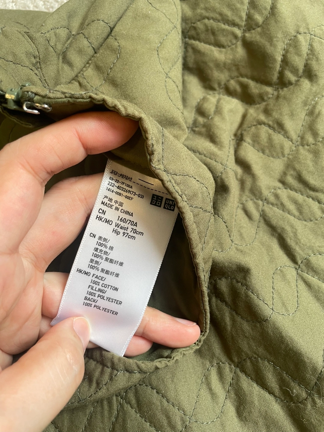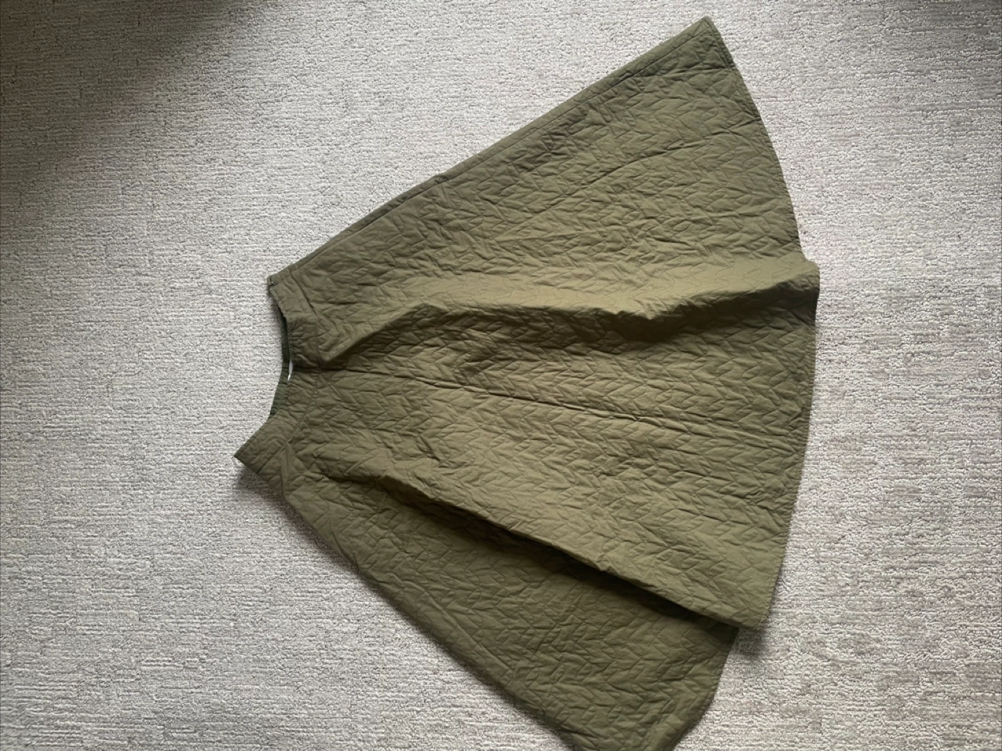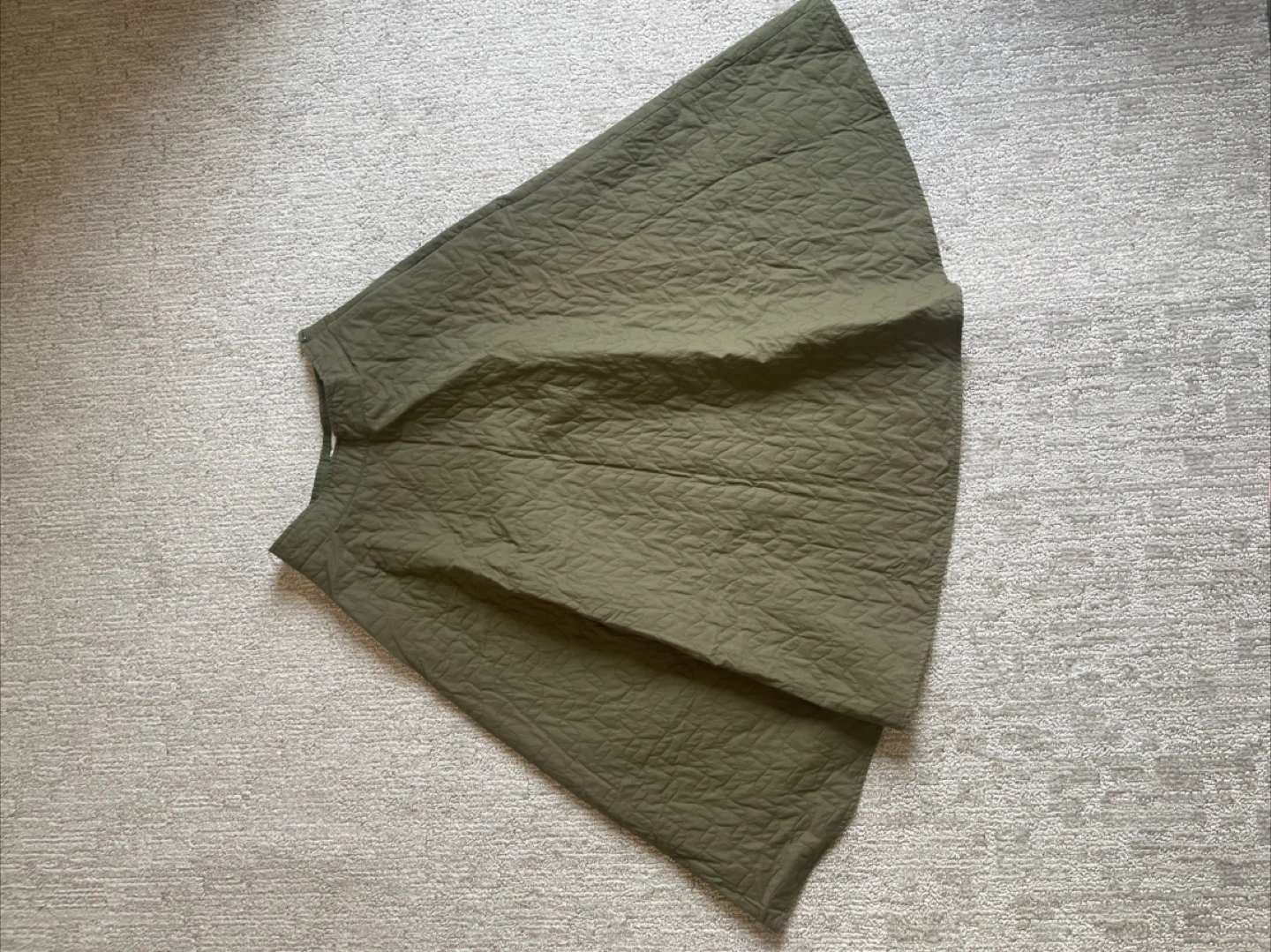 Quilted A-line midi skirt by Uniqlo JW Anderson. Features a soft olive green colour and wavy stitch pattern. Made in China with 100% cotton face and 100% polyester filling and back. Waist 70cm, hip 97cm.