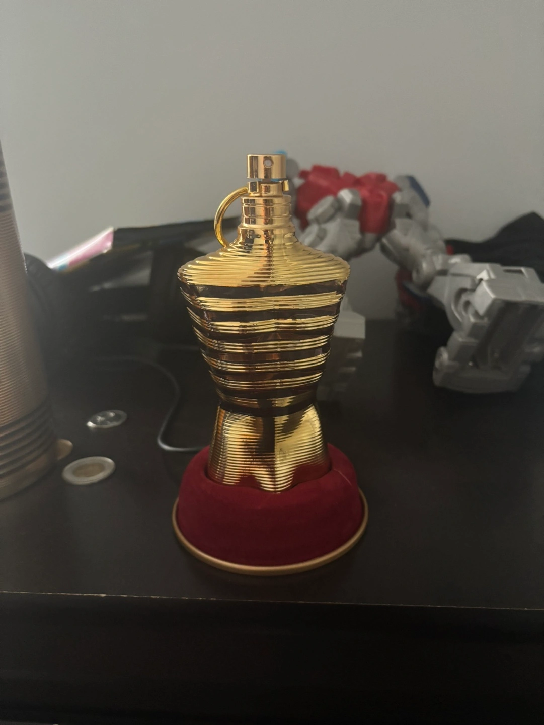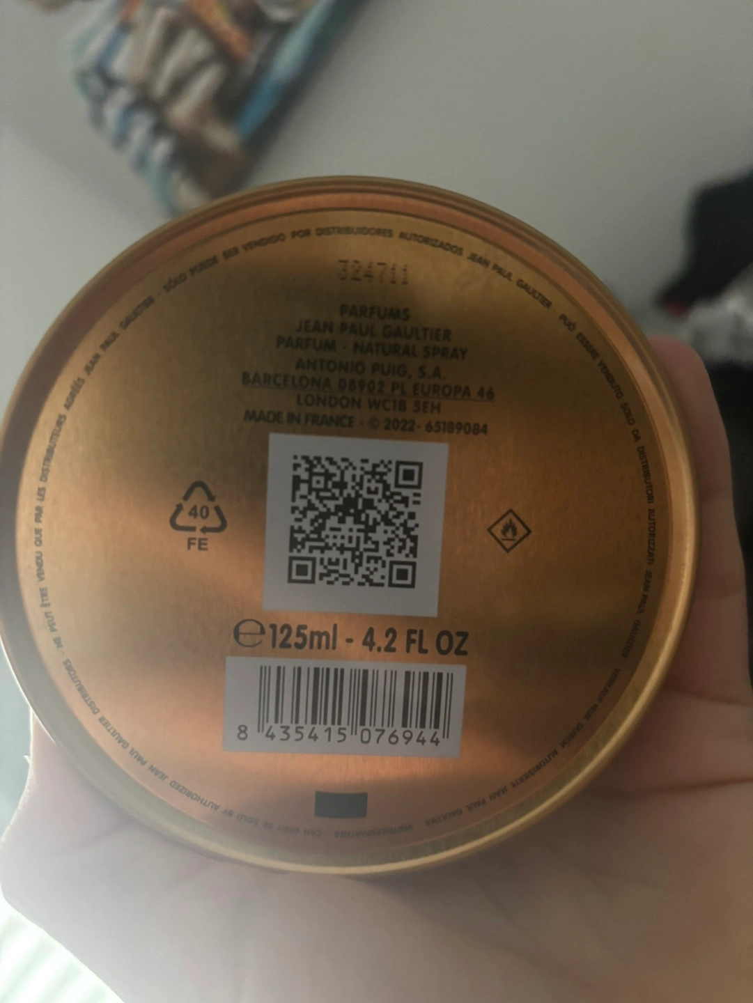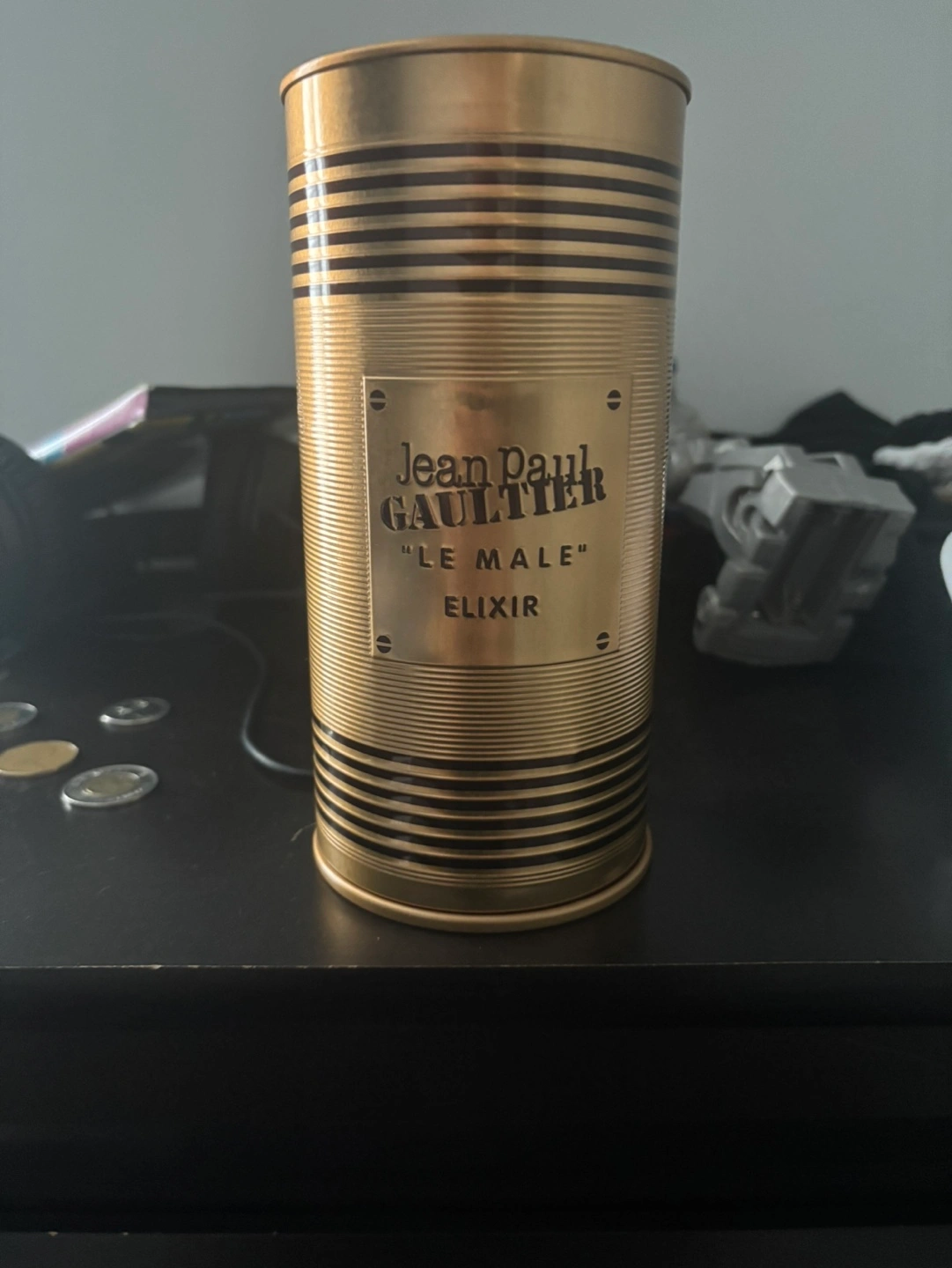 Gold-coloured perfume bottle, 125ml. Comes in a matching gold box. A unique, collectible item.