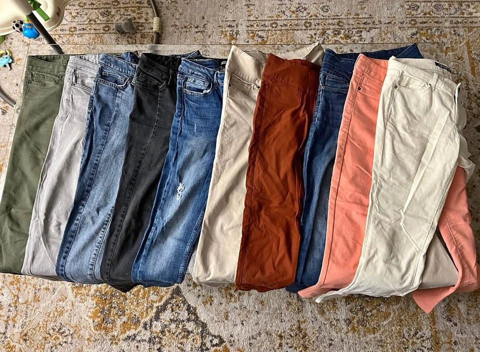 9Green and cream color jeans sold and third jeans from left and from right both sold. Rest are in very good condition. Selling my all clothes because gained weight after baby. Mostly size24-26 rage. $3 each. Pick up sandalwood and Kennedy intersection.