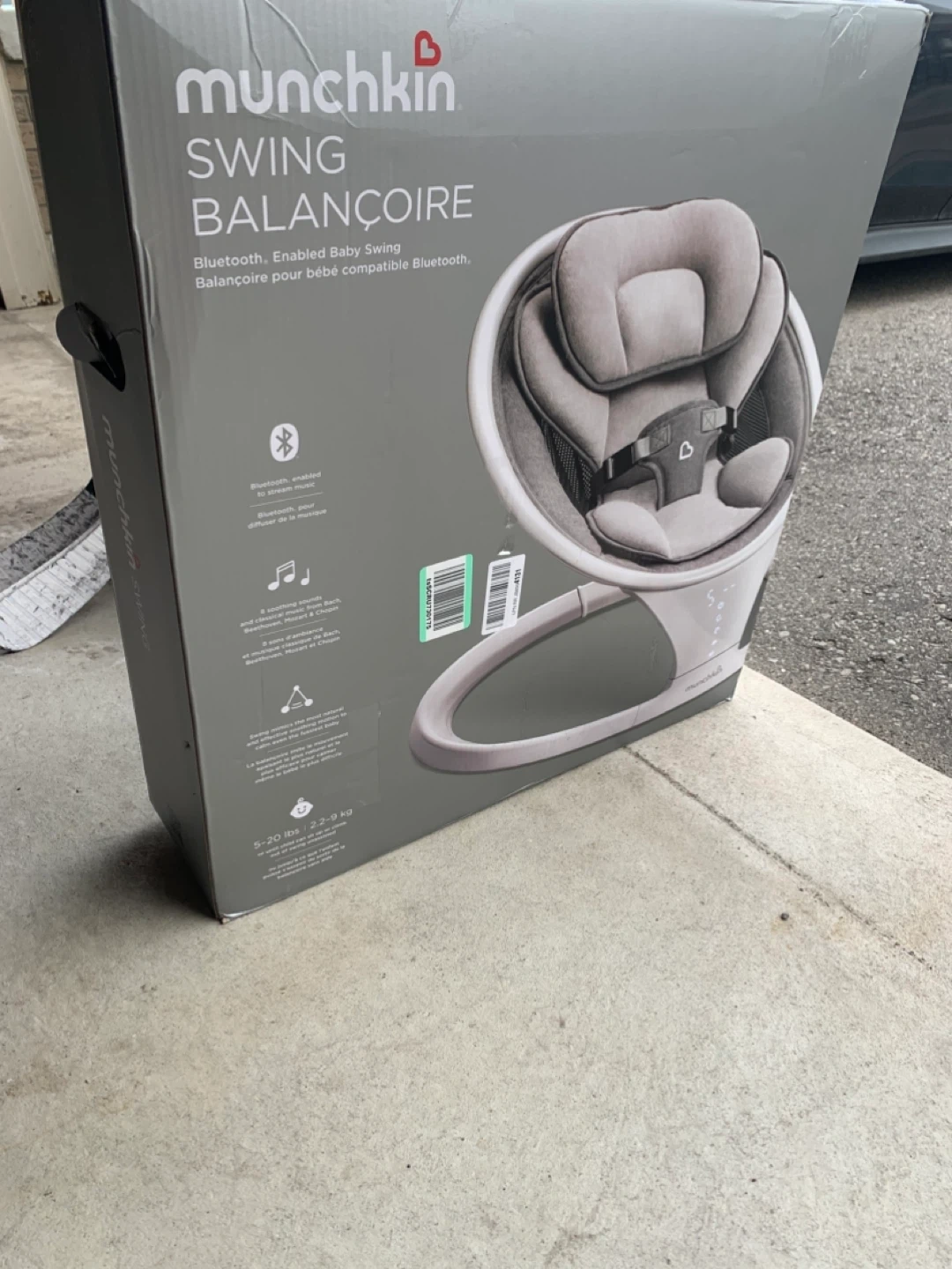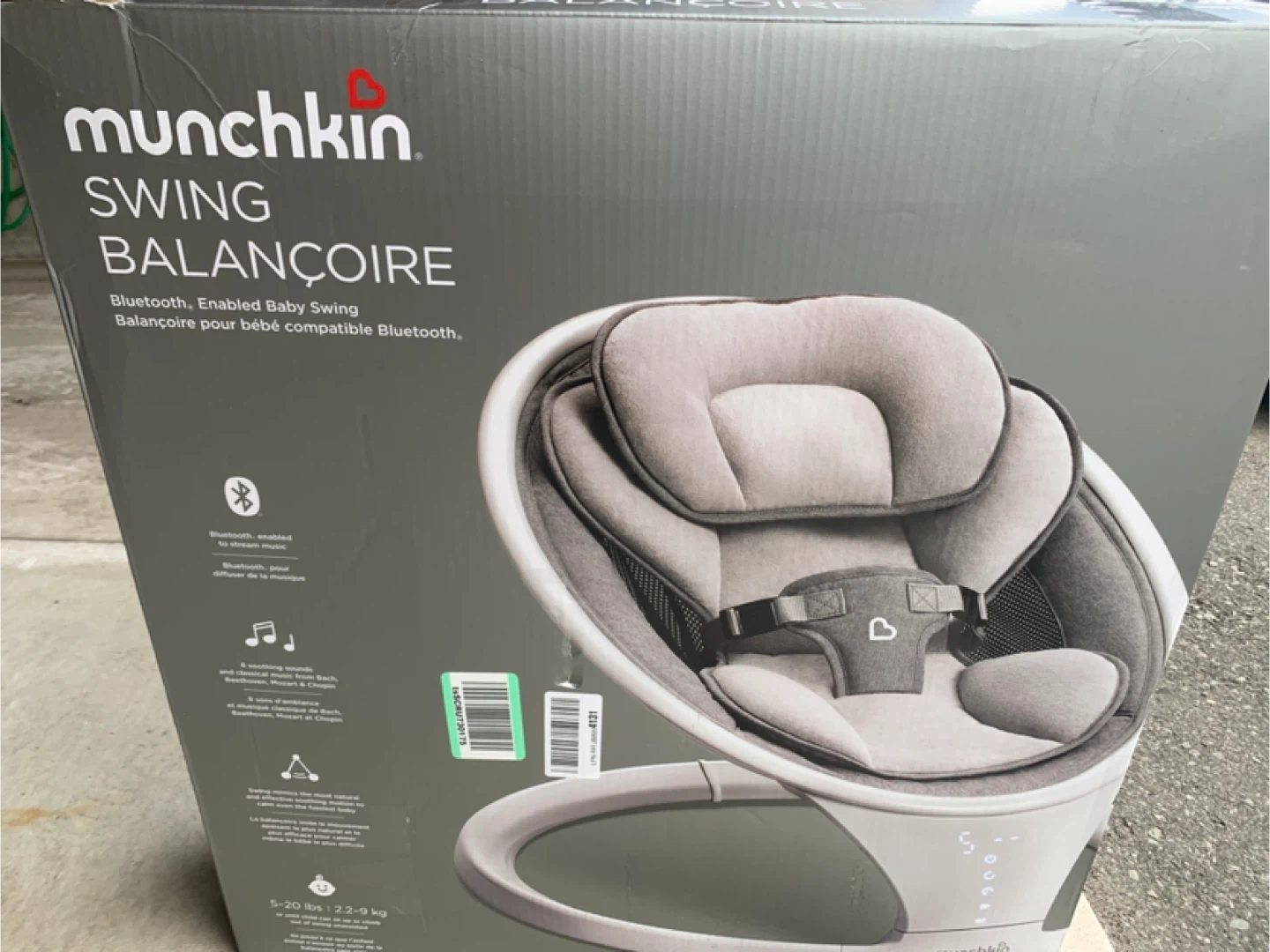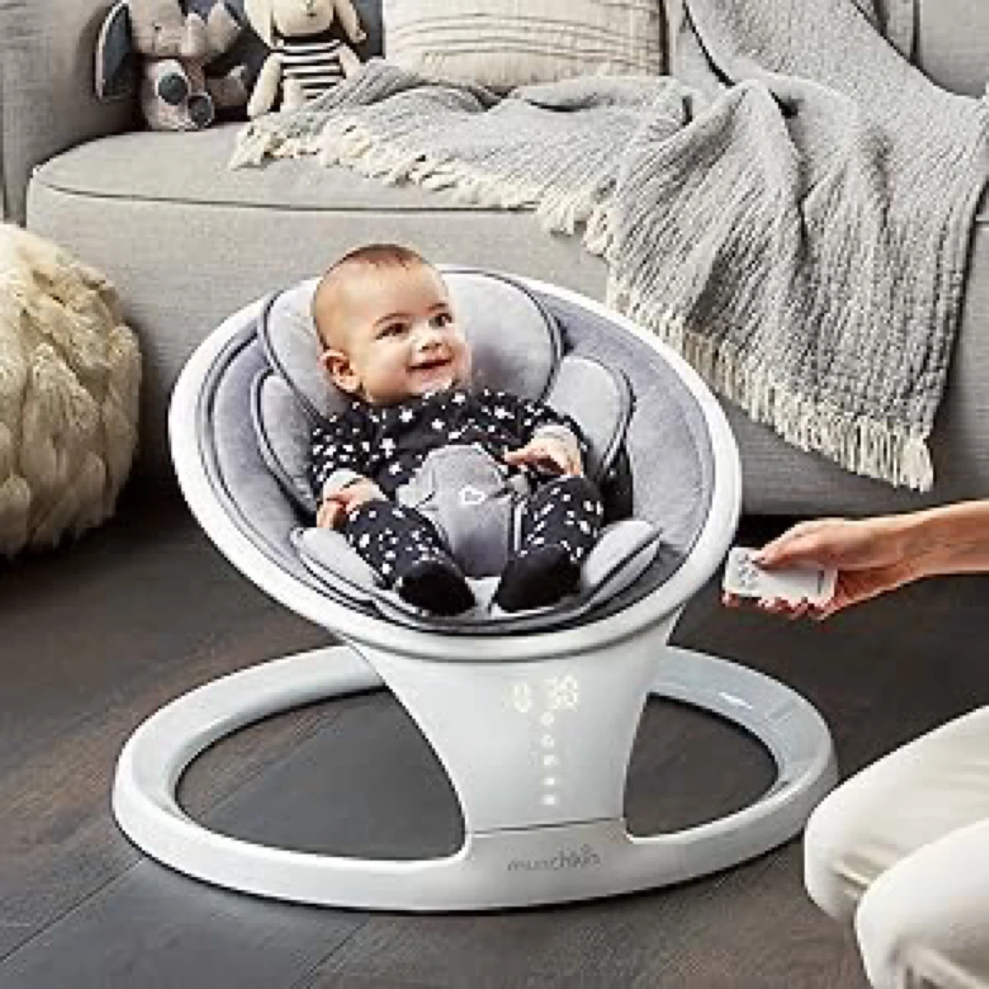 Munchkin Bluetooth Enabled Lightweight Baby Swing with Natural Sway. It has 5 ranges of motion and includes a remote control. This swing is suitable for babies from 5-20 lbs (2.2-9 kg).