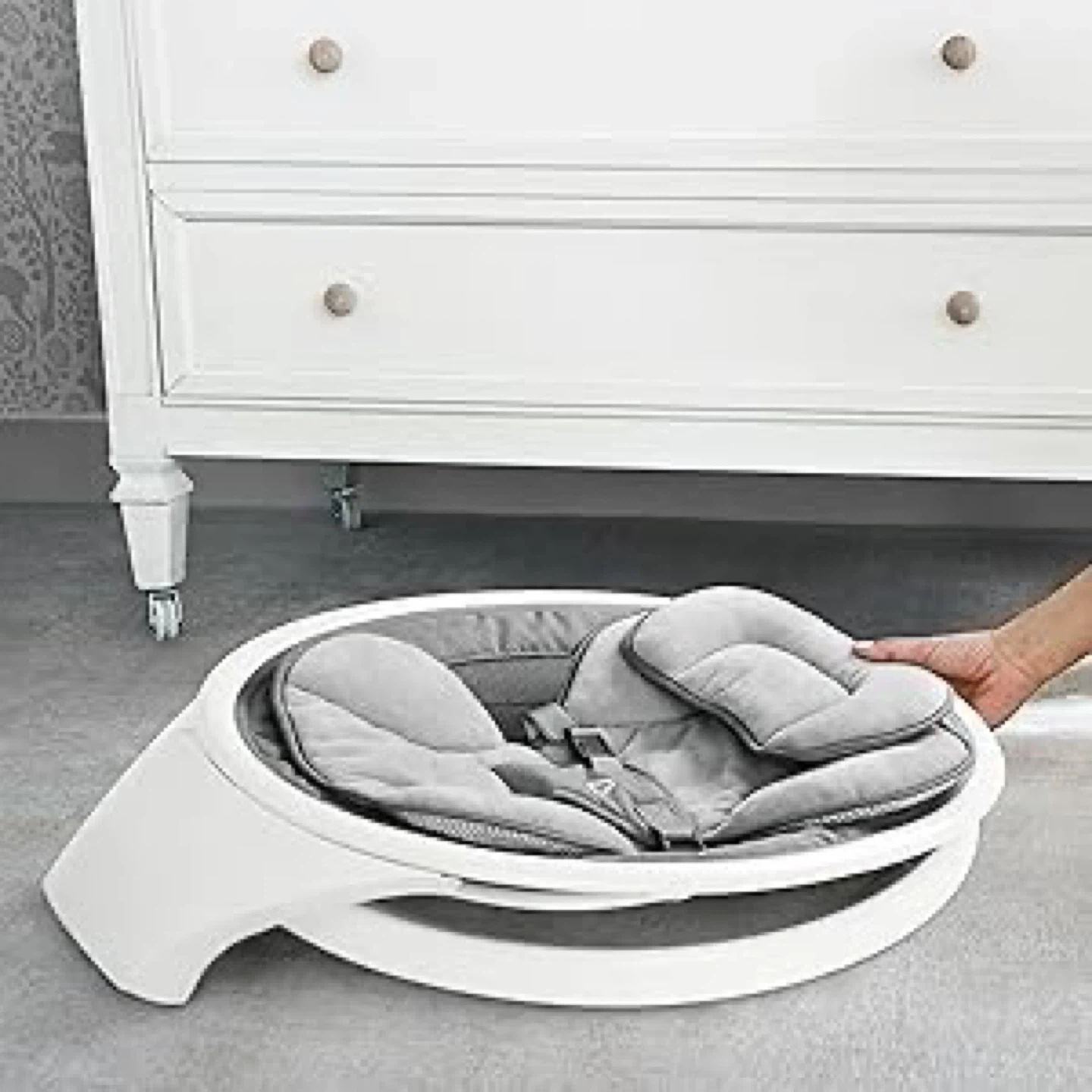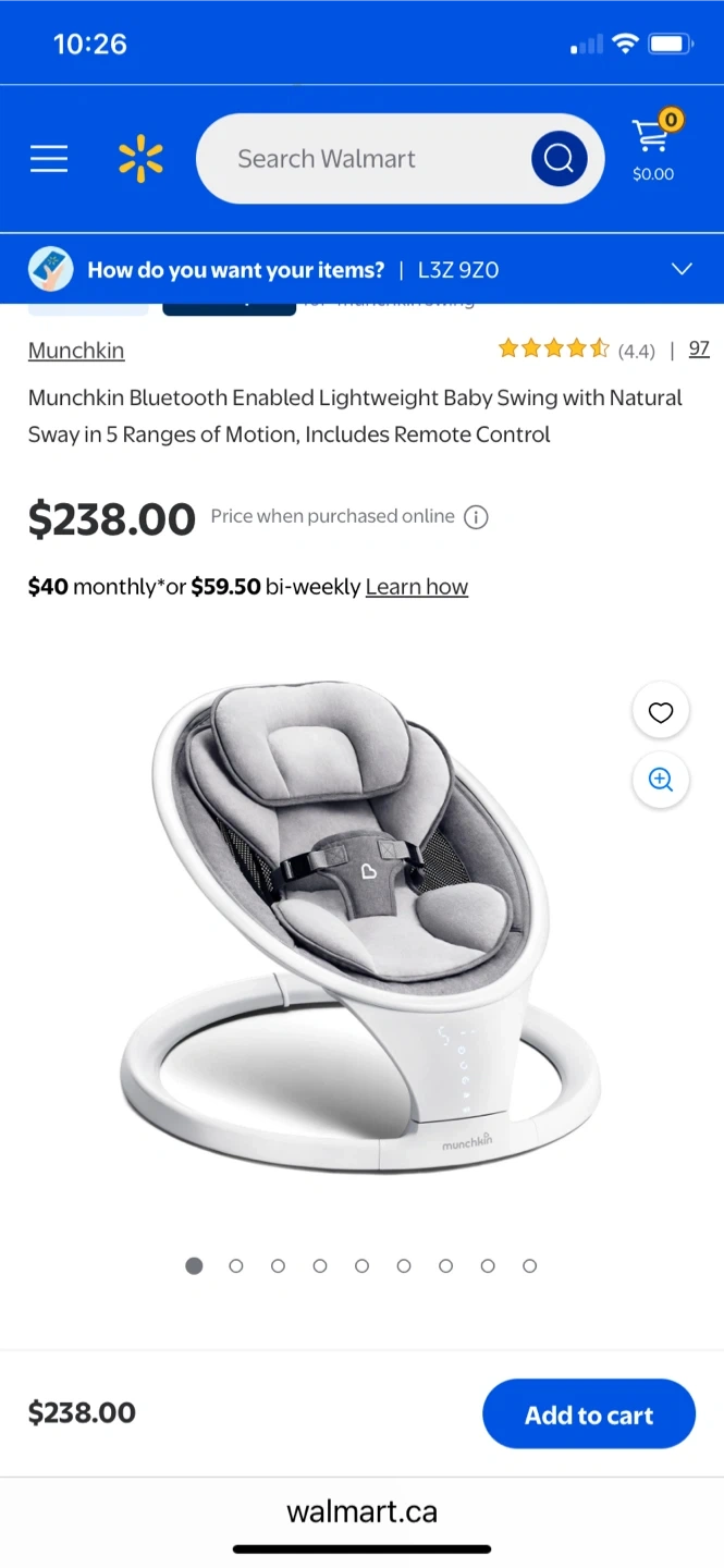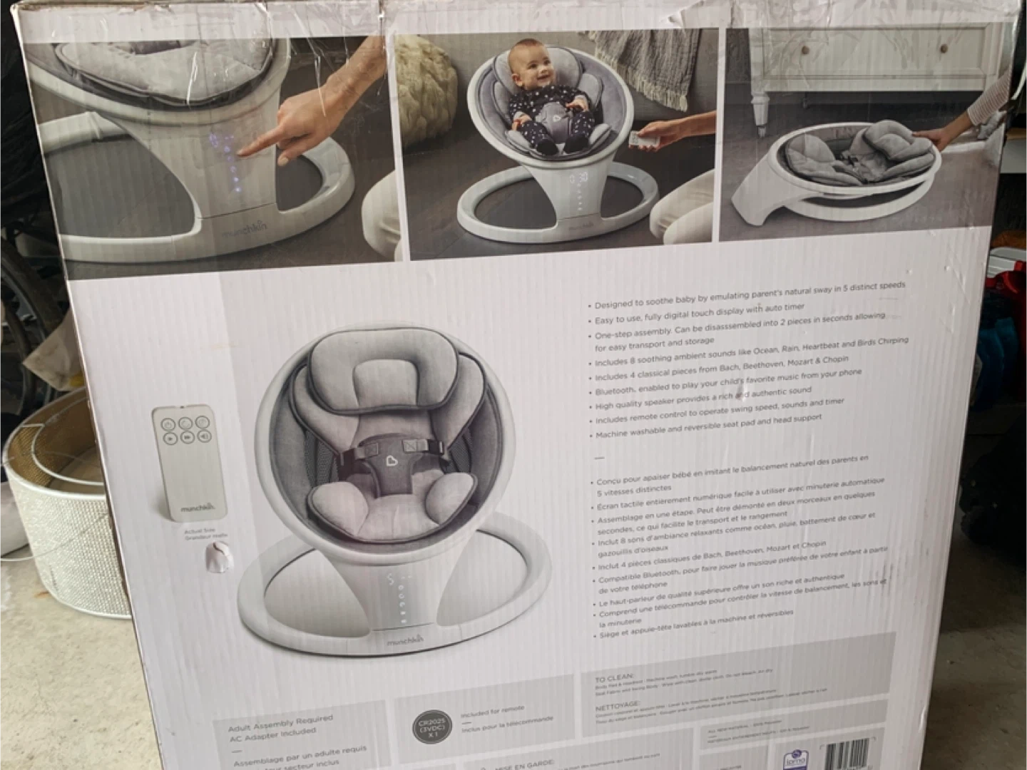 Munchkin Bluetooth Enabled Lightweight Baby Swing with Natural Sway. It has 5 ranges of motion and includes a remote control. This swing is suitable for babies from 5-20 lbs (2.2-9 kg).