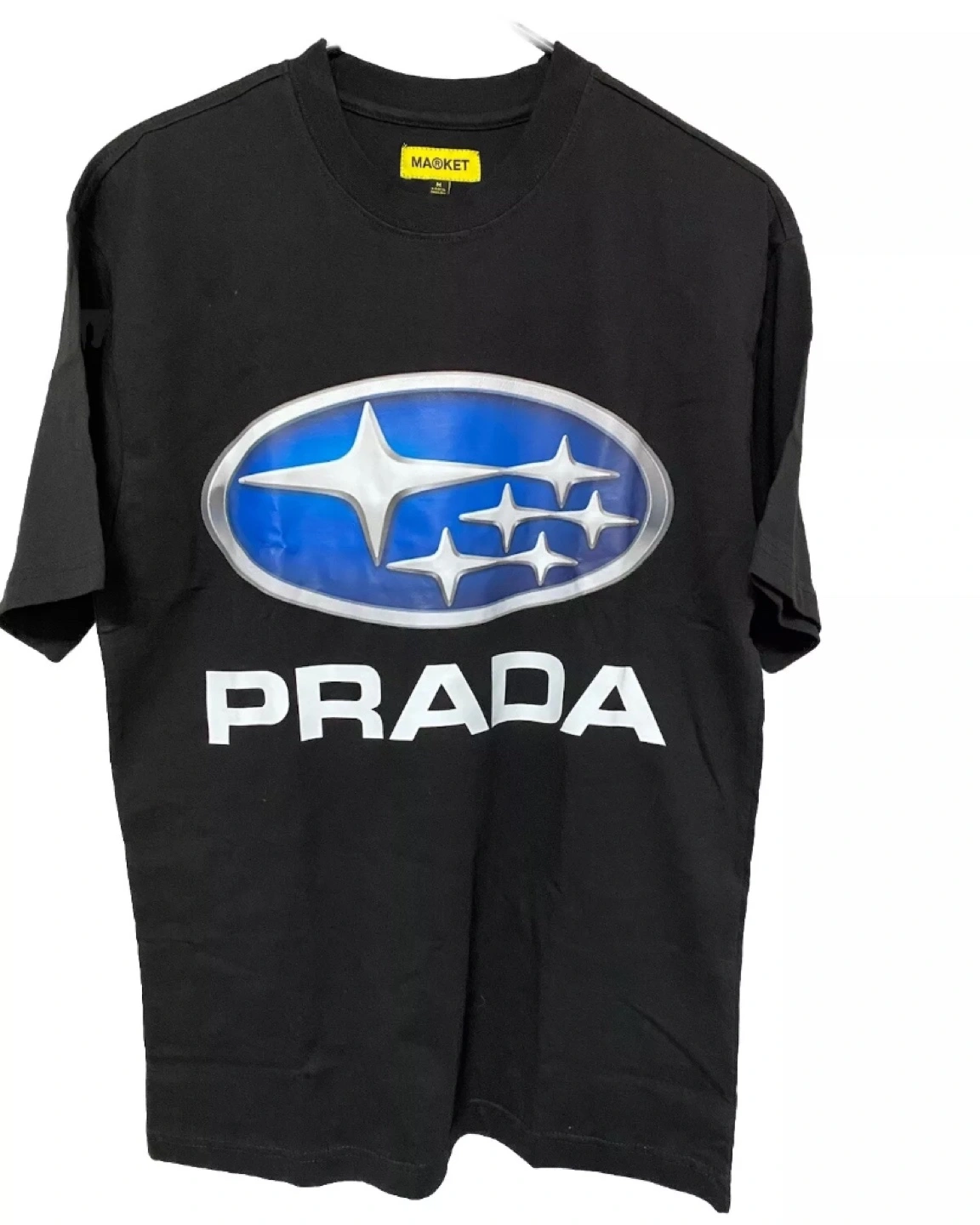 Black t-shirt with a Subaru logo and Prada lettering. Size M.