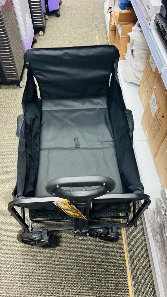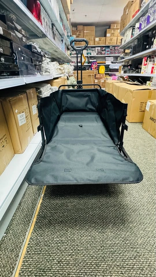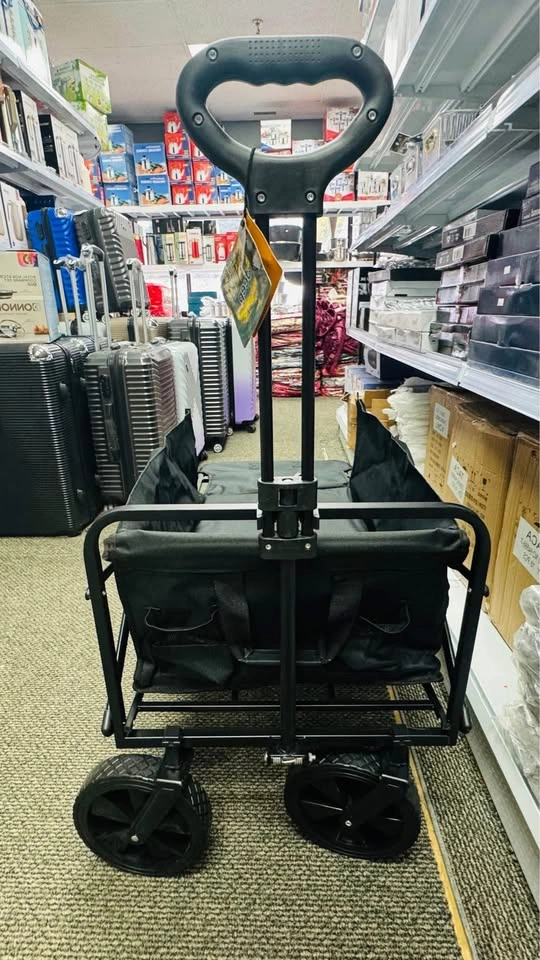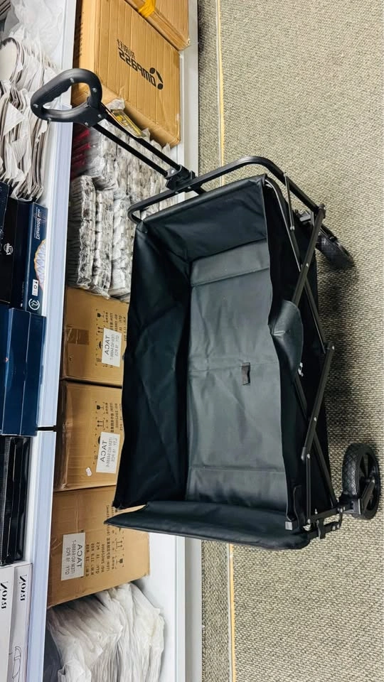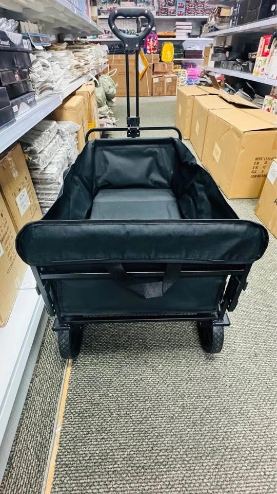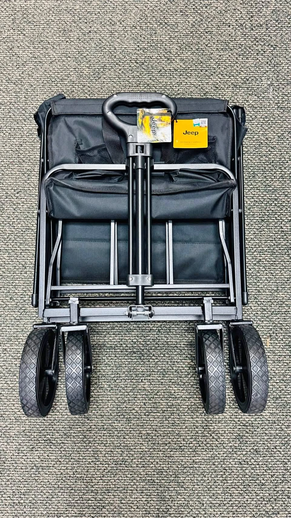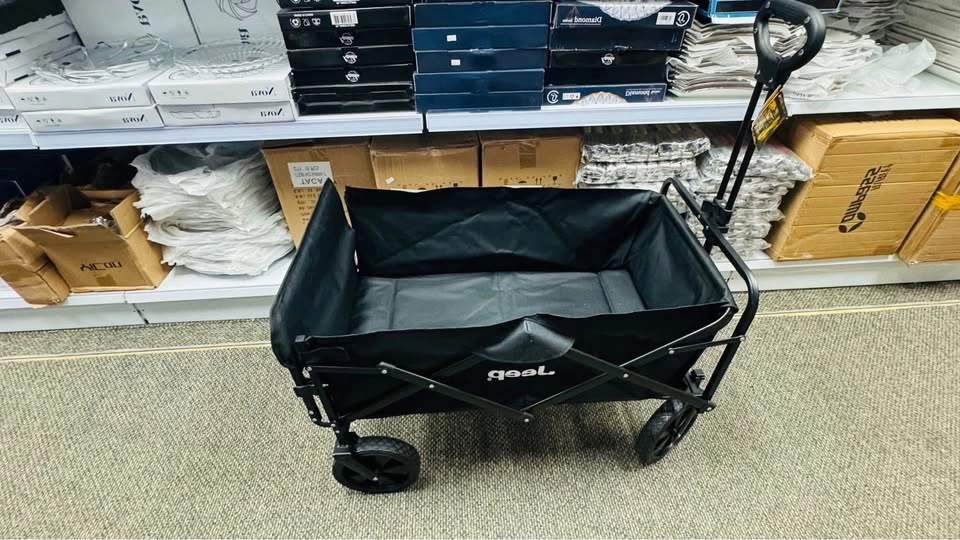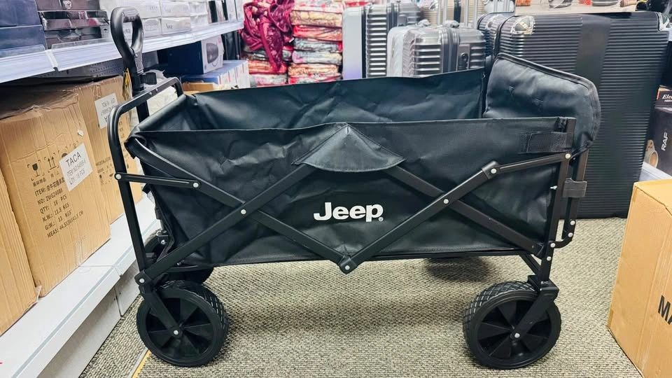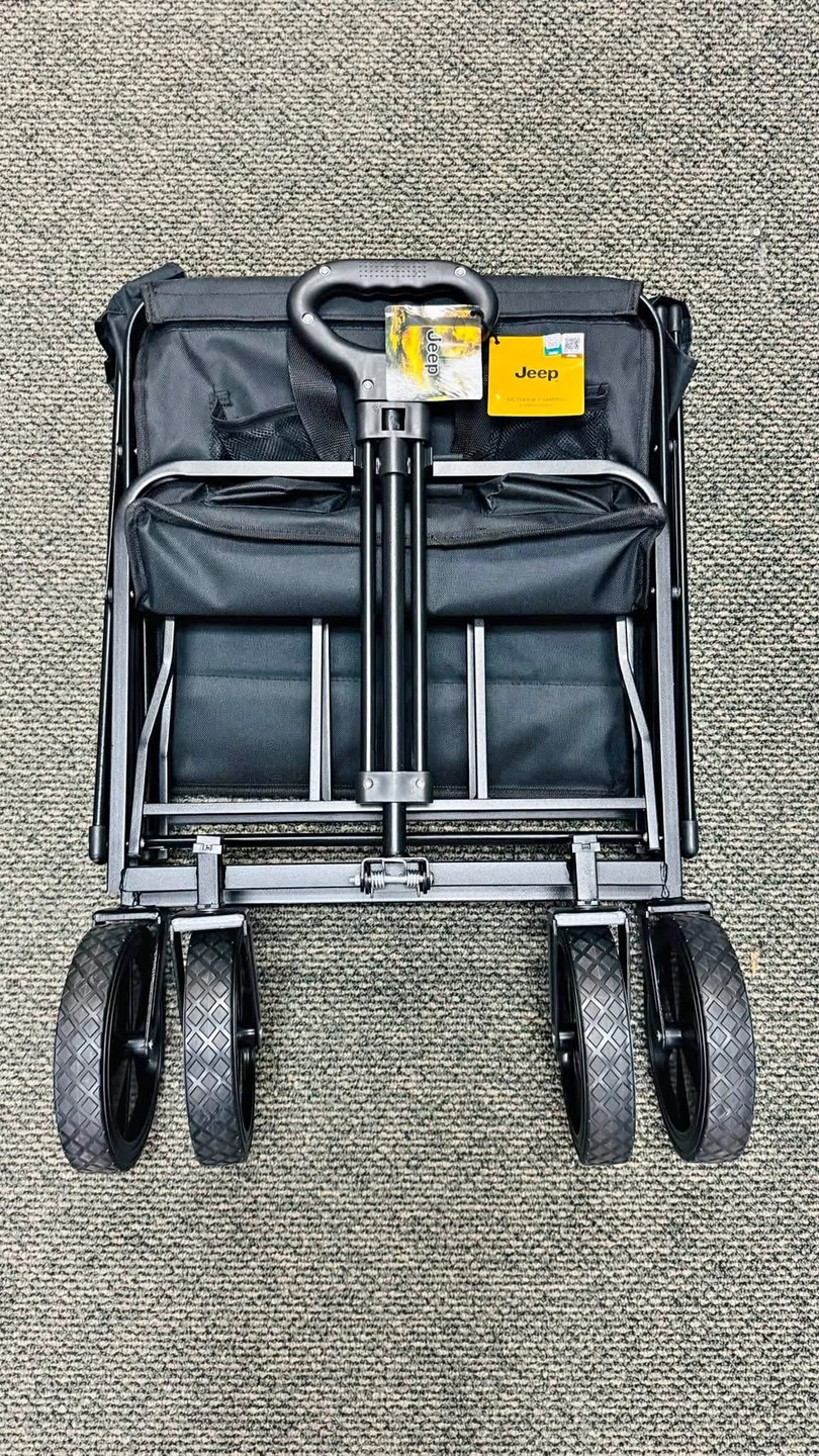 The Jeep Foldable Utility Wagon is a durable and versatile cart perfect for carrying groceries, luggage, tools, or outdoor gear. Designed with a strong steel frame and heavy-duty fabric, it offers excellent stability and long-lasting performance. The wagon features large all-terrain wheels for smooth movement on various surfaces and a collapsible design for easy storage and transport. Ideal for shopping, travel, beach trips, or everyday hauling needs. Key Features:, • Brand: Jeep • Foldable and compact for convenient storage • Sturdy steel frame construction. • Heavy-duty fabric for durability. • Large, rugged wheels for all terrains. • Comfortable handle for easy pulling.,
