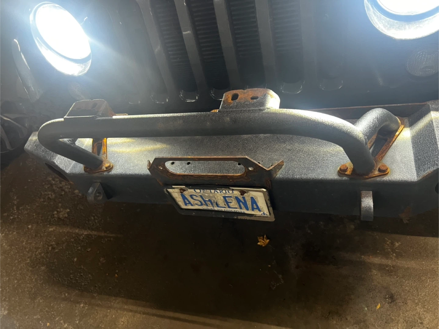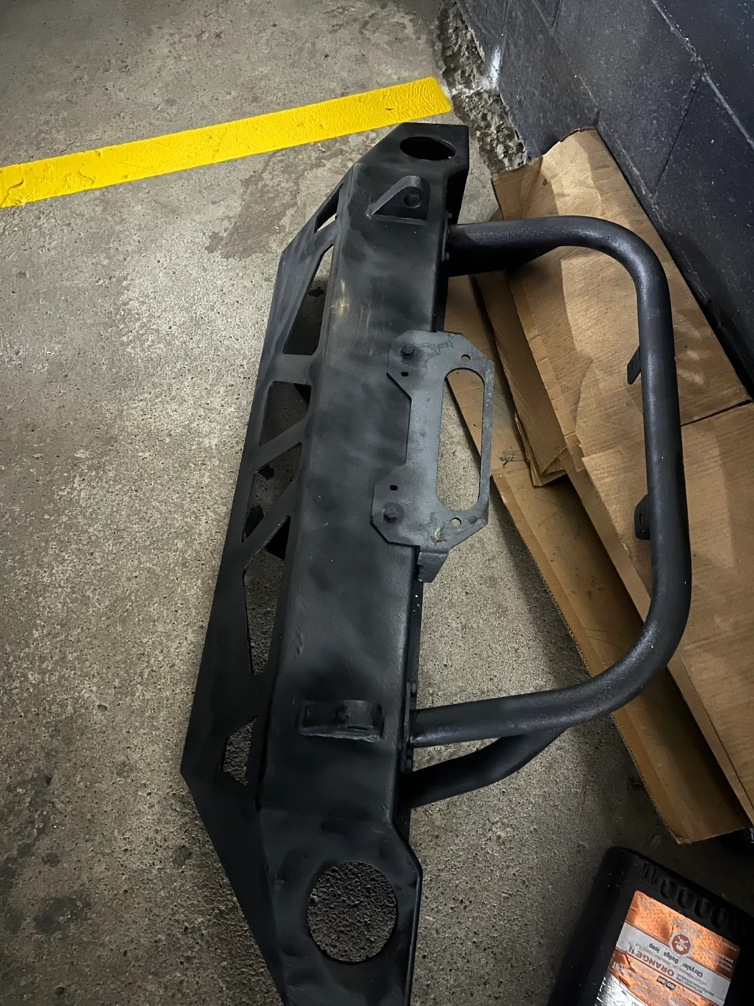 Selling a used front bumper for a Jeep Wrangler. It's black and has some signs of wear, but we did sand and re-paint it as you can see in the pictures. Great for off-roading!