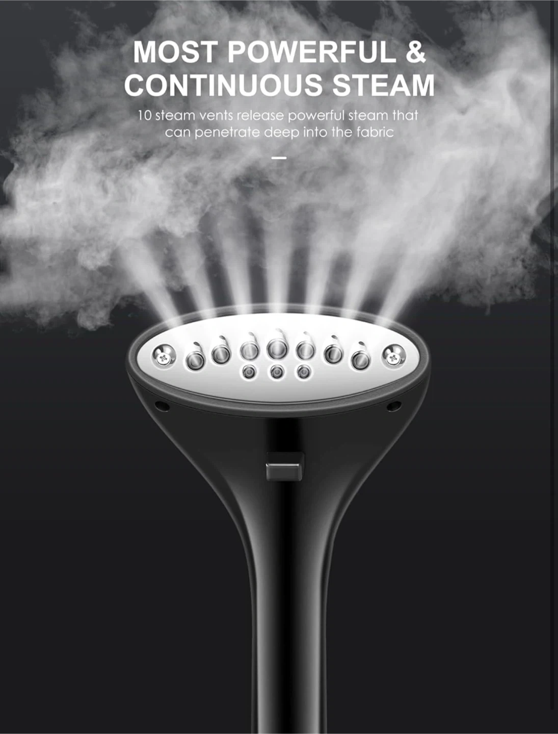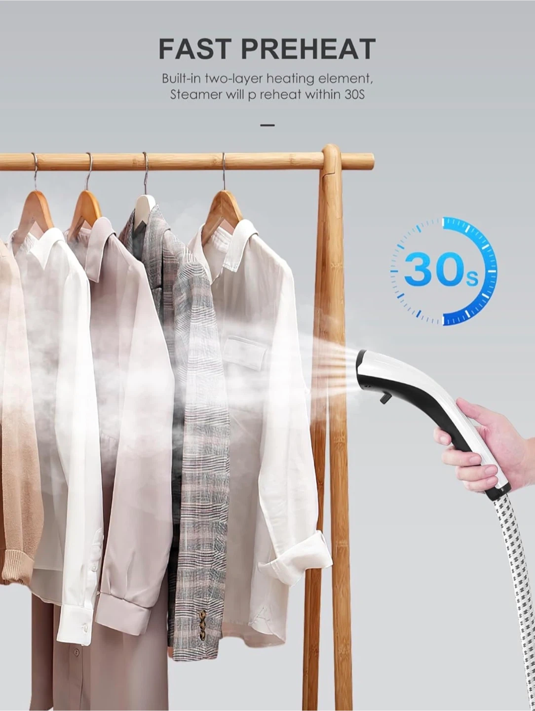 This Reemix garment steamer is designed for fast and effective wrinkle removal. It features a powerful and continuous steam output with 10 steam vents that penetrate deep into fabric. The unit preheats within 30 seconds. It's great for refreshing clothes with luxury care.