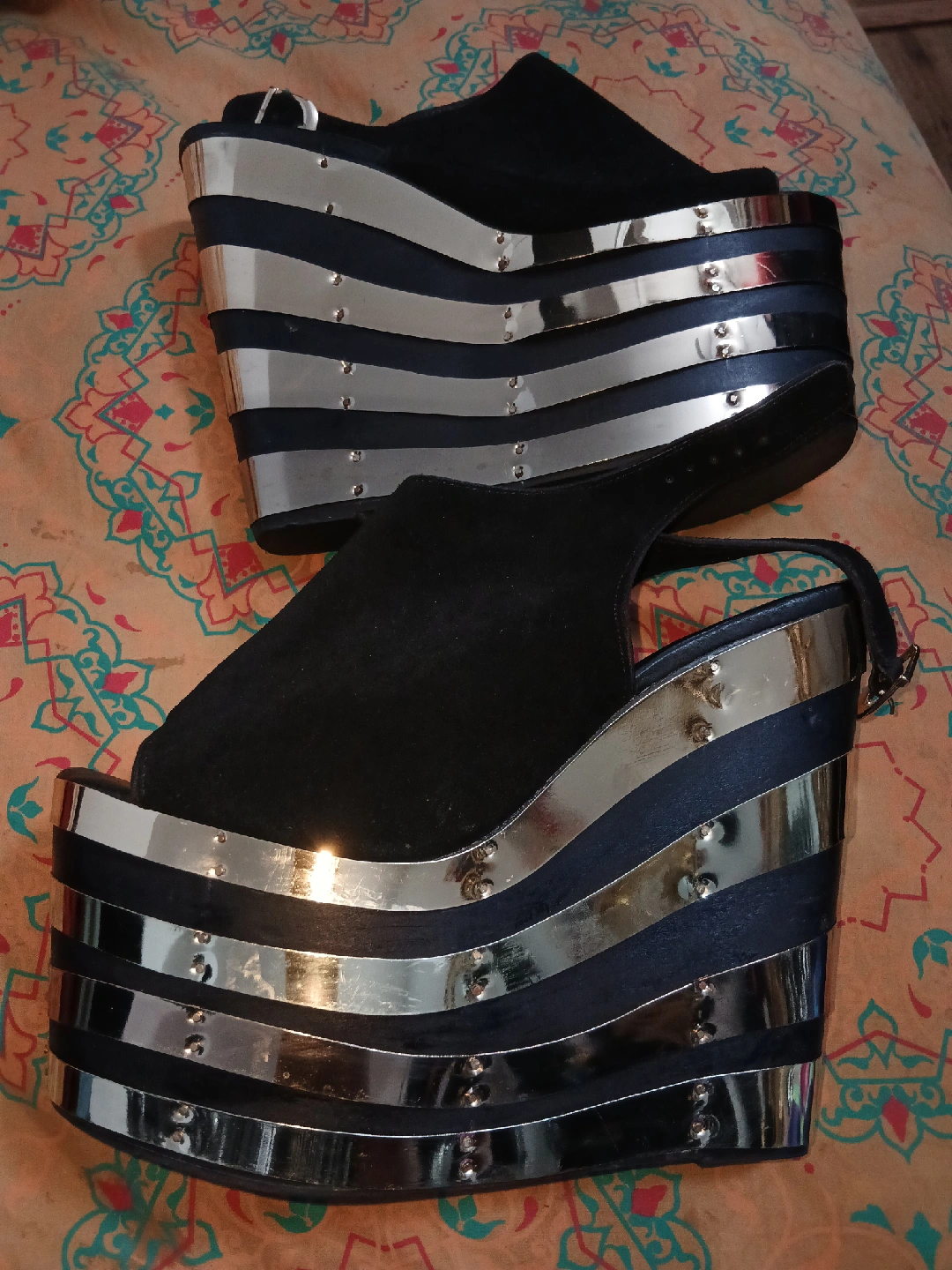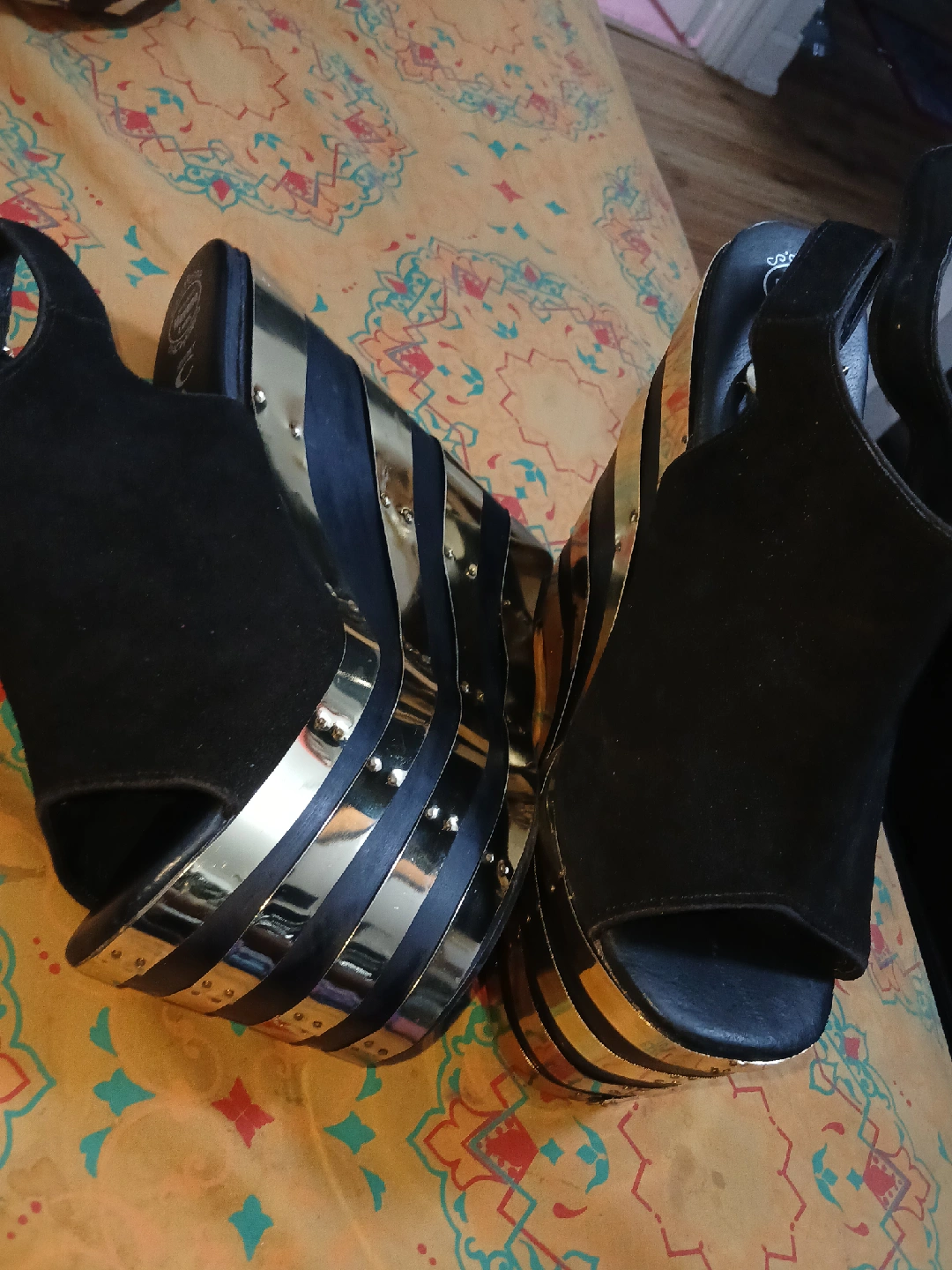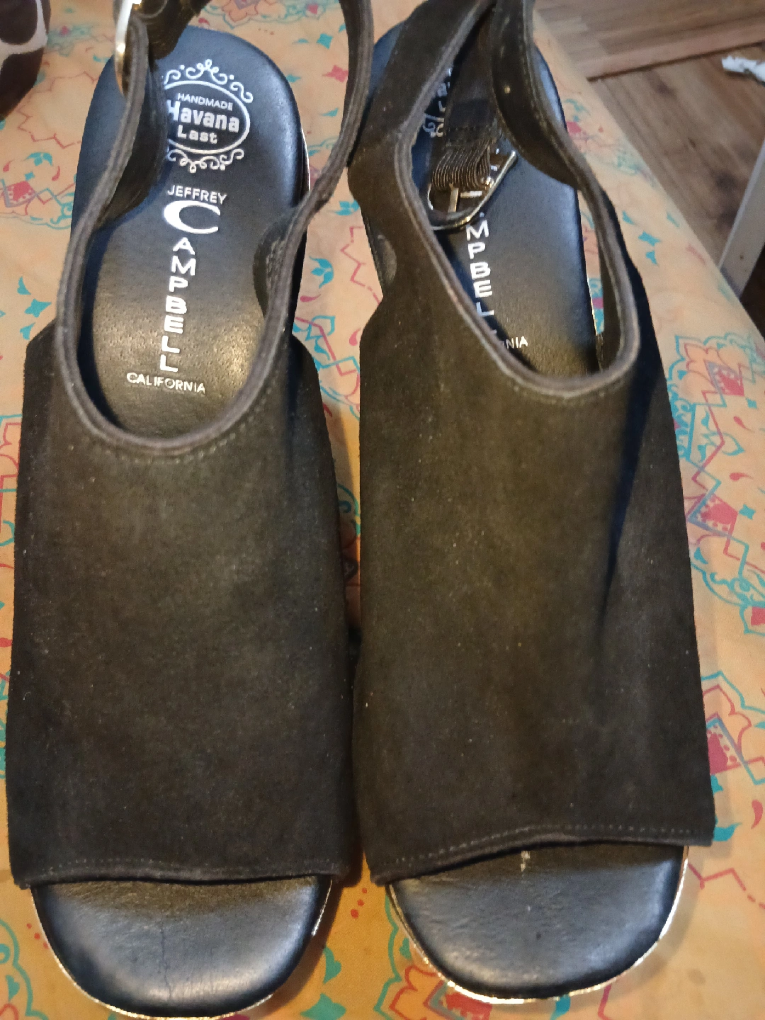 Check out these Jeffrey Campbell Havana platform sandals! They are a size 11 and feature a unique design with black suede and gold-tone accents. The upper is made of leather and the sole is man-made. These platform sandals are sure to make a statement!