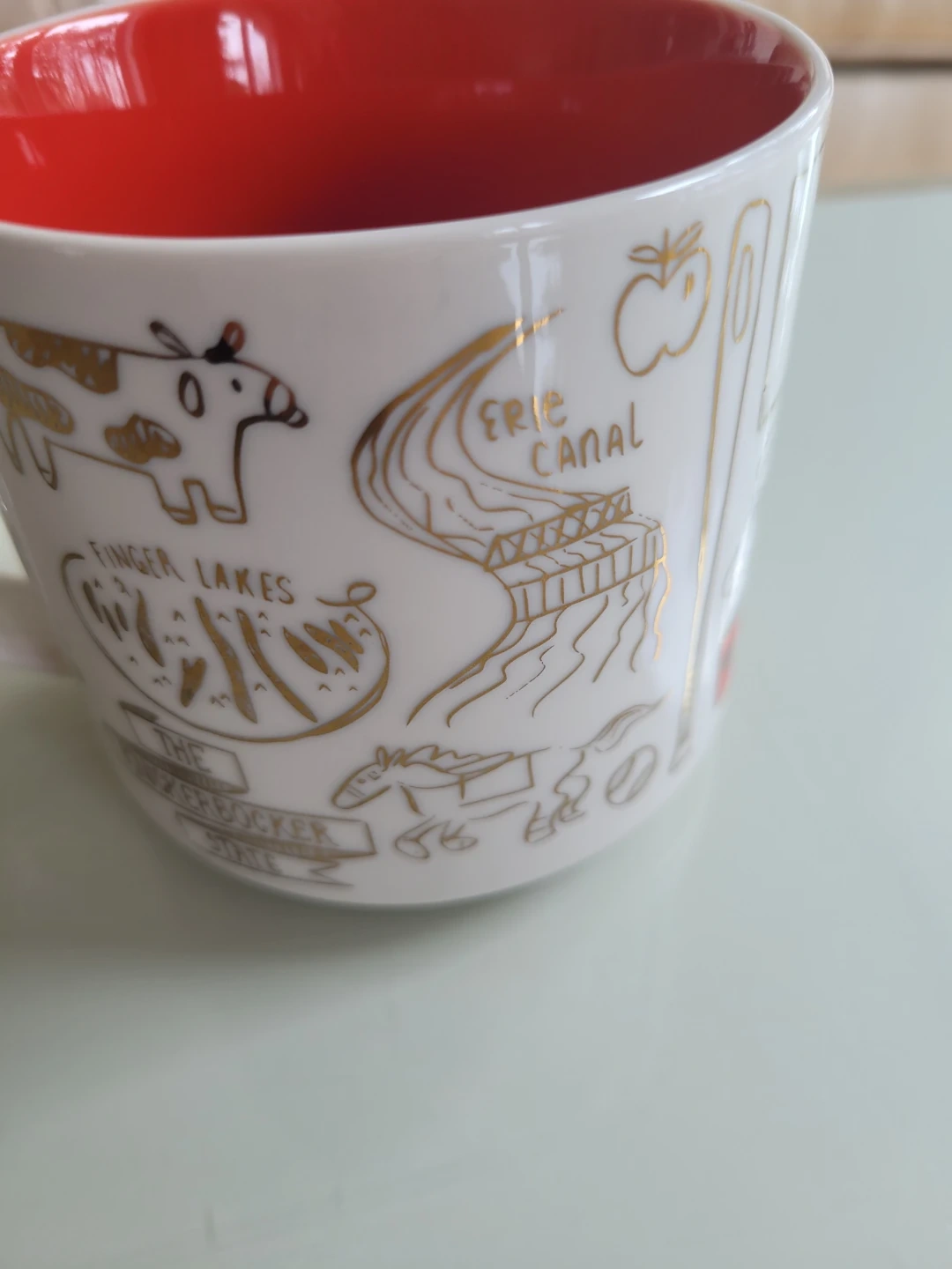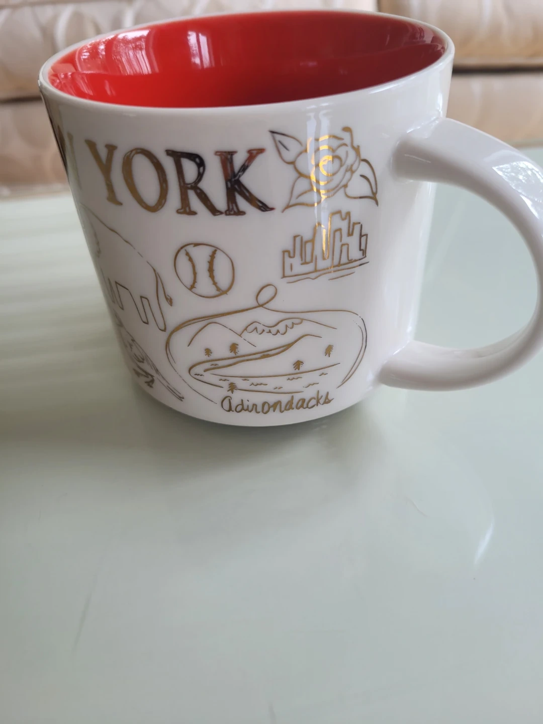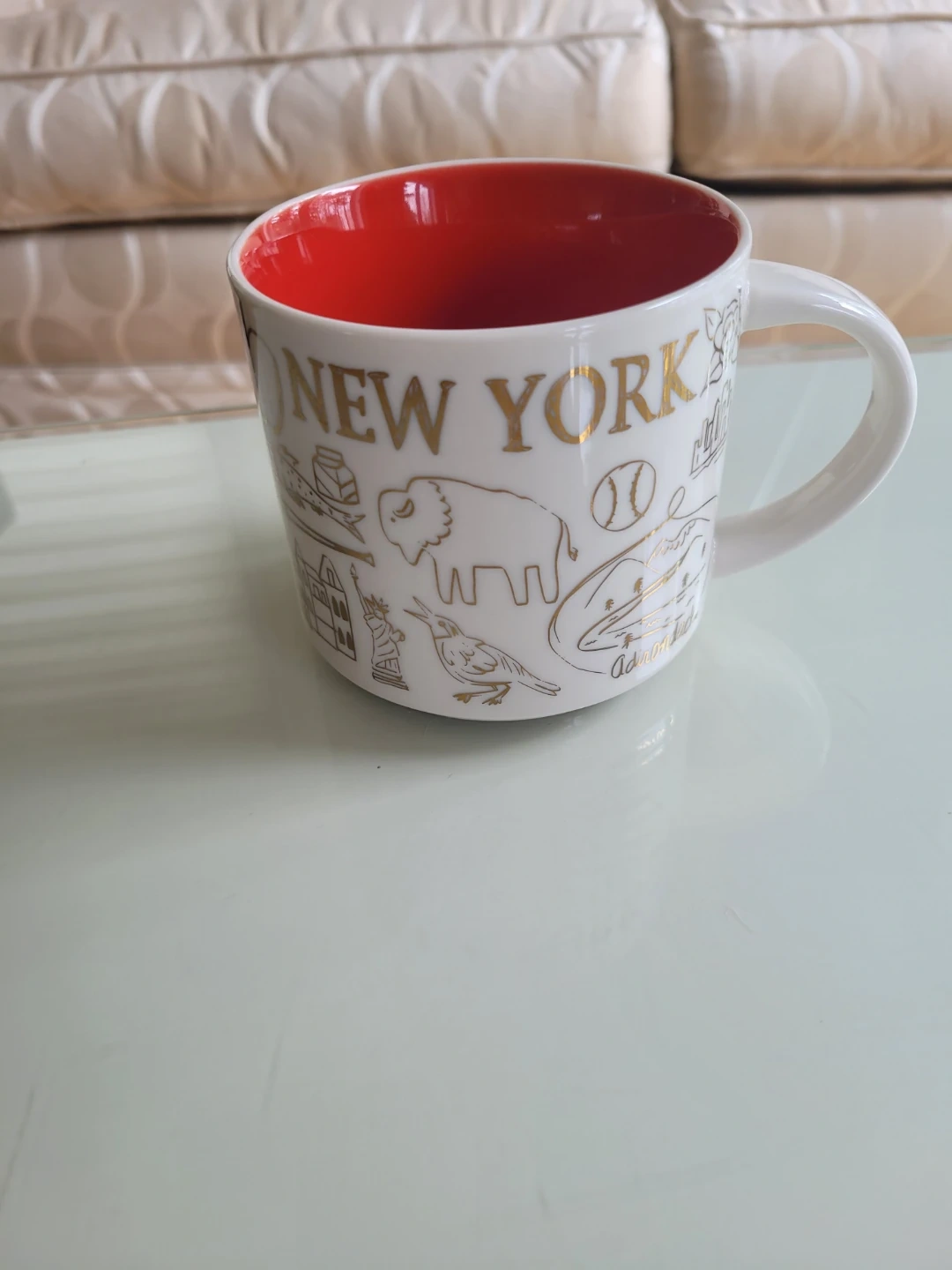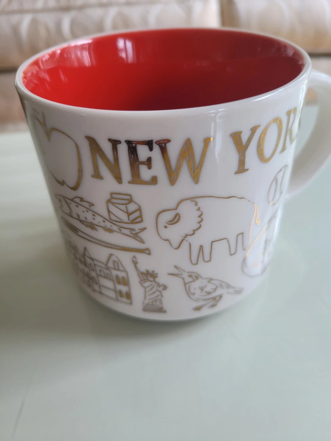 White ceramic mug with red interior, featuring gold line drawings of New York landmarks and text. It's a standard mug size, perfect for your morning coffee or tea!