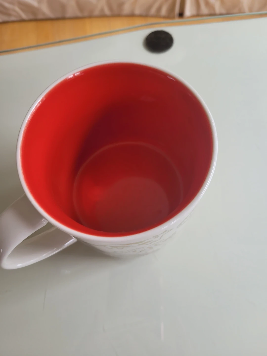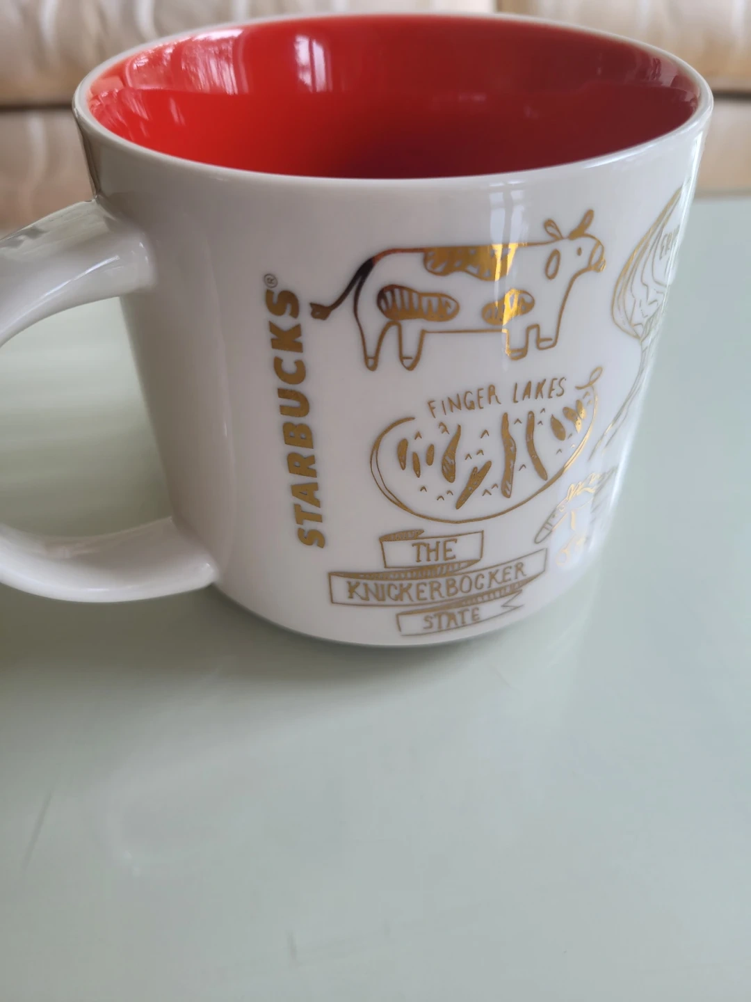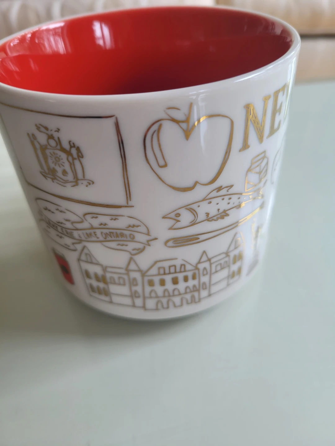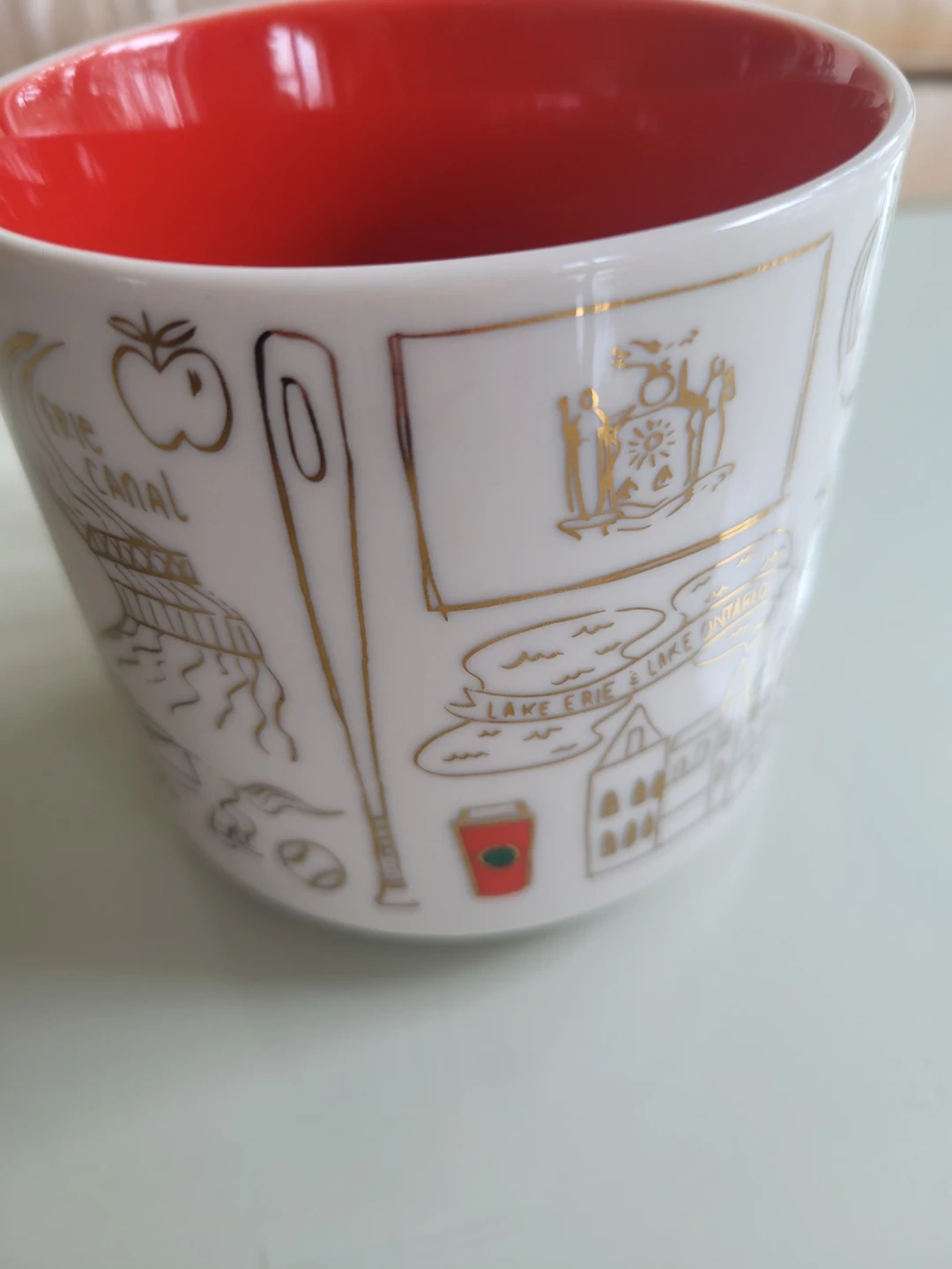 White ceramic mug with red interior, featuring gold line drawings of New York landmarks and text. It's a standard mug size, perfect for your morning coffee or tea!