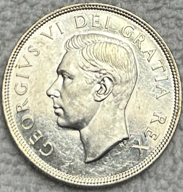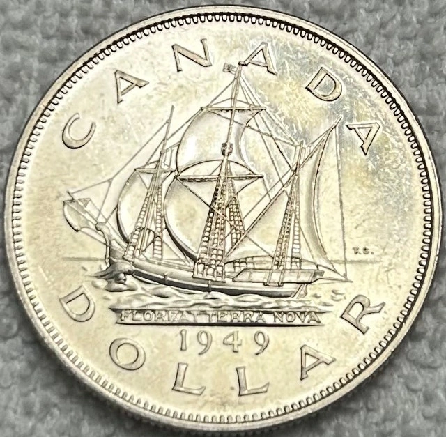 This is a 1949 Canadian silver dollar, a beautiful piece of history featuring the iconic sailing ship design on one side and King George VI on the other. It's a fantastic collectible for anyone interested in Canadian numismatics. The coin is in line with other graded examples maintaining a clear design and detail that makes it clearly that grade. Cash accepted, Cashless payment accepted.