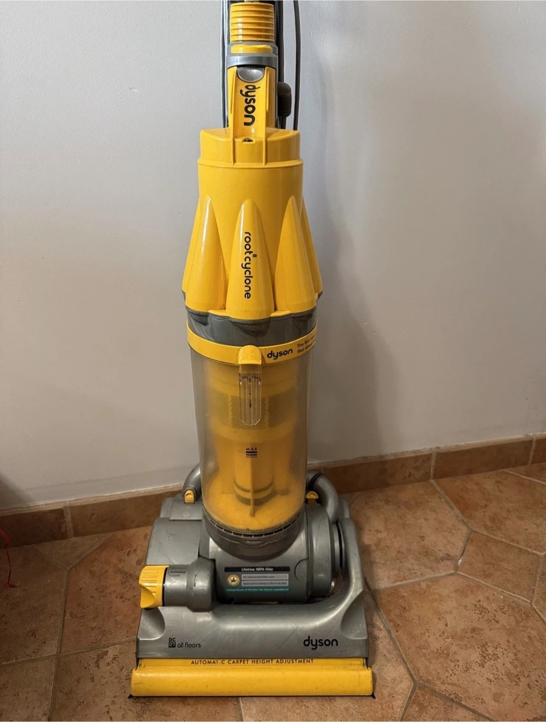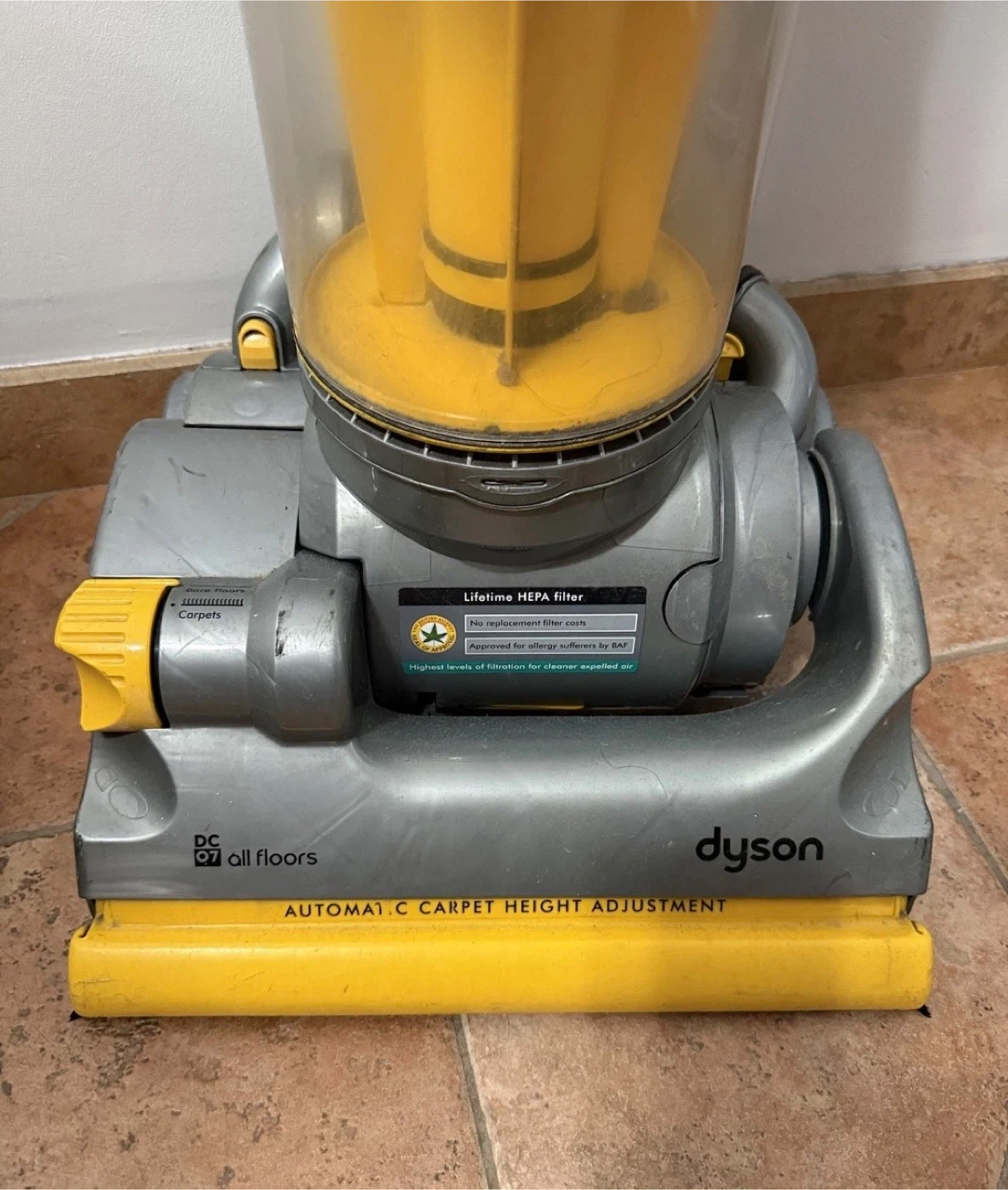 The product is a Dyson Cyclone DC07 All Floors Upright Bagless Vacuum Cleaner in yellow color. This vacuum cleaner features HEPA filters, 1400W power, and a 20 lb weight. It includes a crevice tool and is suitable for multi-surface cleaning, rotating brushes, and for pet owners.
