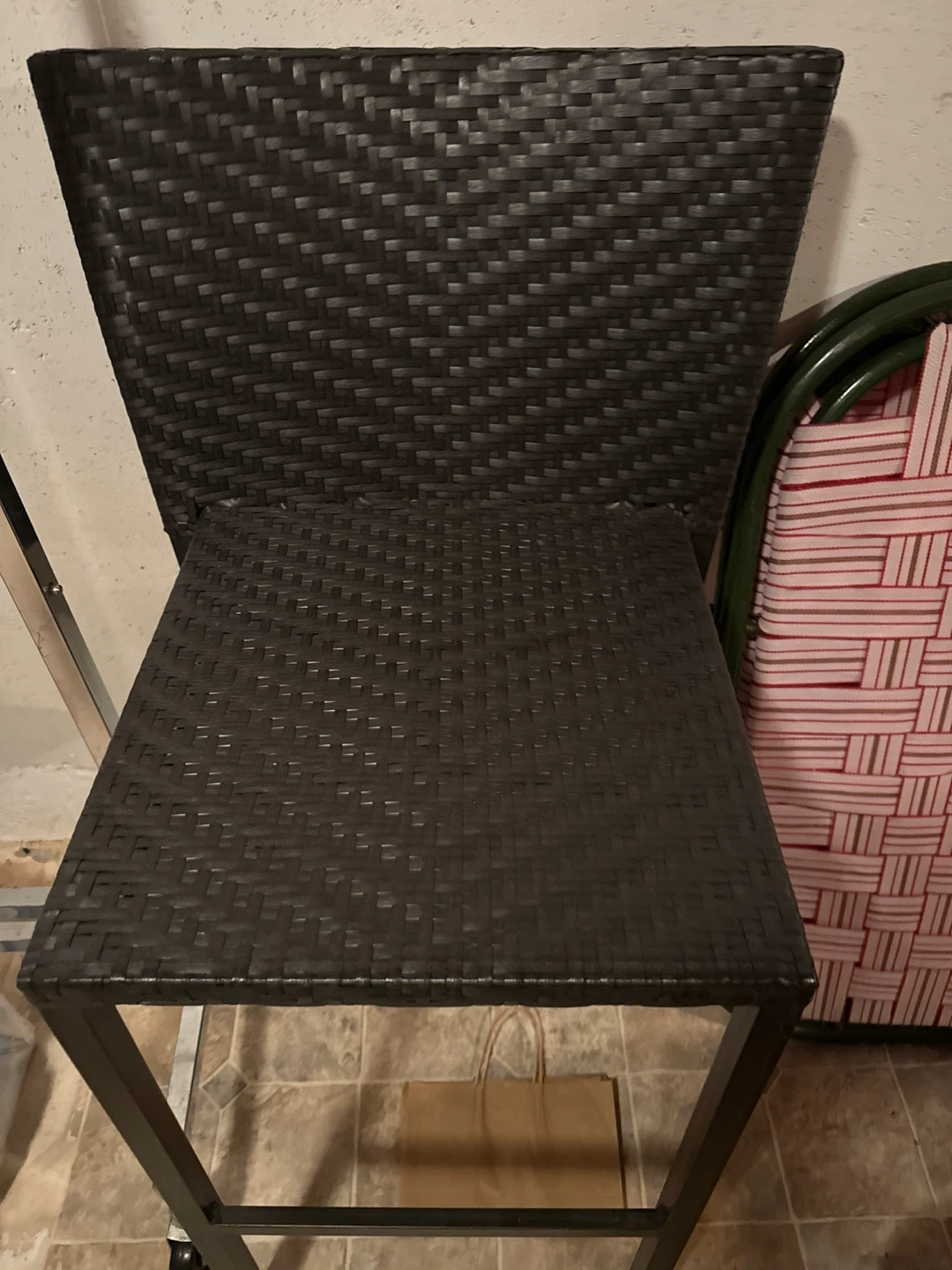 This is a dark woven bar stool with a metal frame. It's a comfortable and stylish seating option. The woven material offers a textured look.
