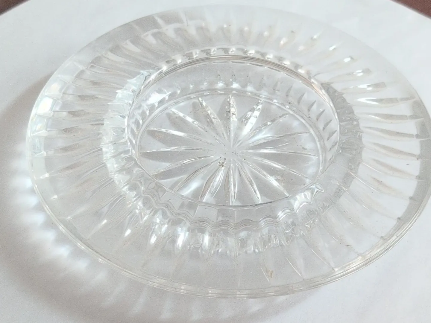 Clear glass coaster or small dish with a fluted rim. Features a sunburst pattern in the centre. Glass material.