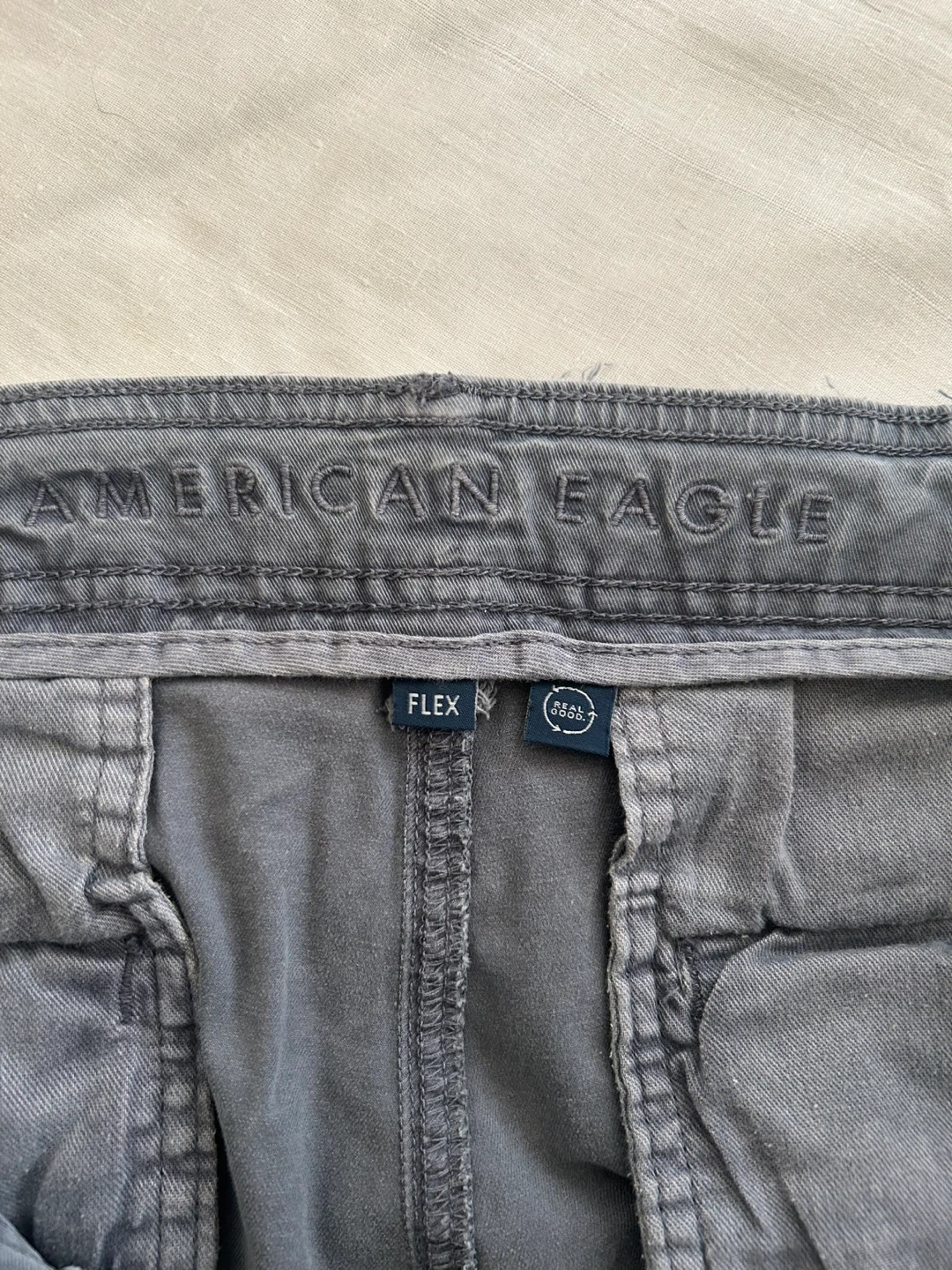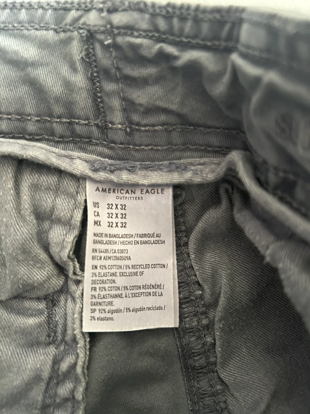 Selling a pair of American Eagle Outfitters Flex cargo pants. They are size 32x32. The material is 92% cotton / 5% recycled cotton / 3% elastane.