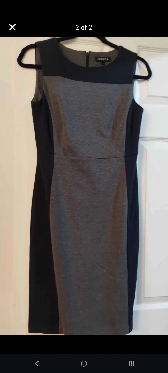 Selling a Jessica Howard dress in size 6! It features a stylish colour-blocked design with grey and black panels. Perfect for work or a special occasion