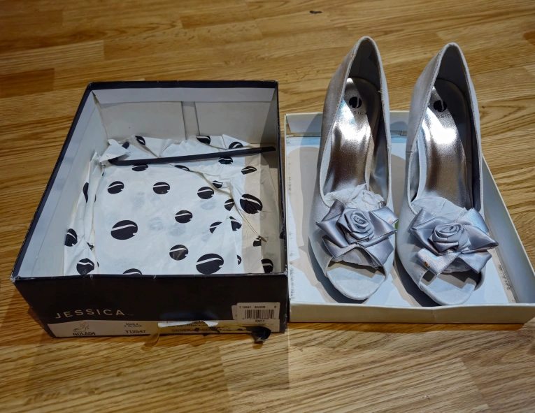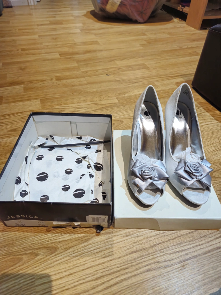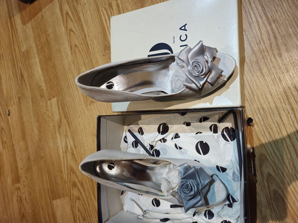 Selling a pair of Jessica heels in silver, size 8M. They come with the original box! These heels feature a cute rose detail on the front.