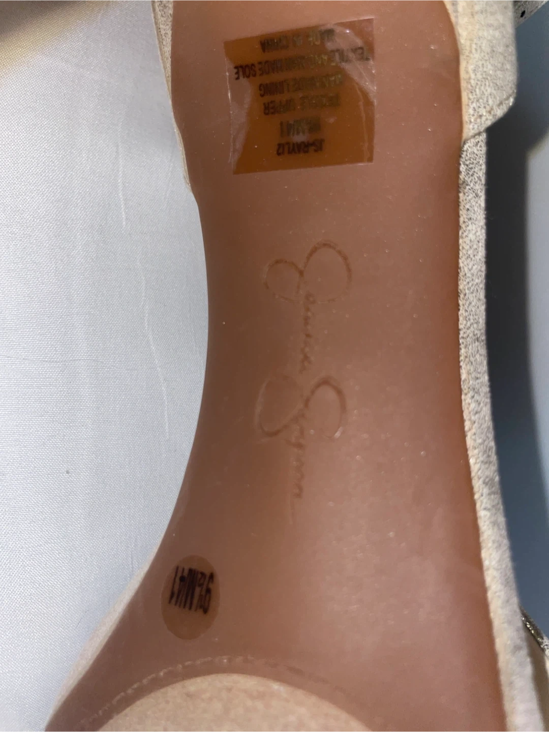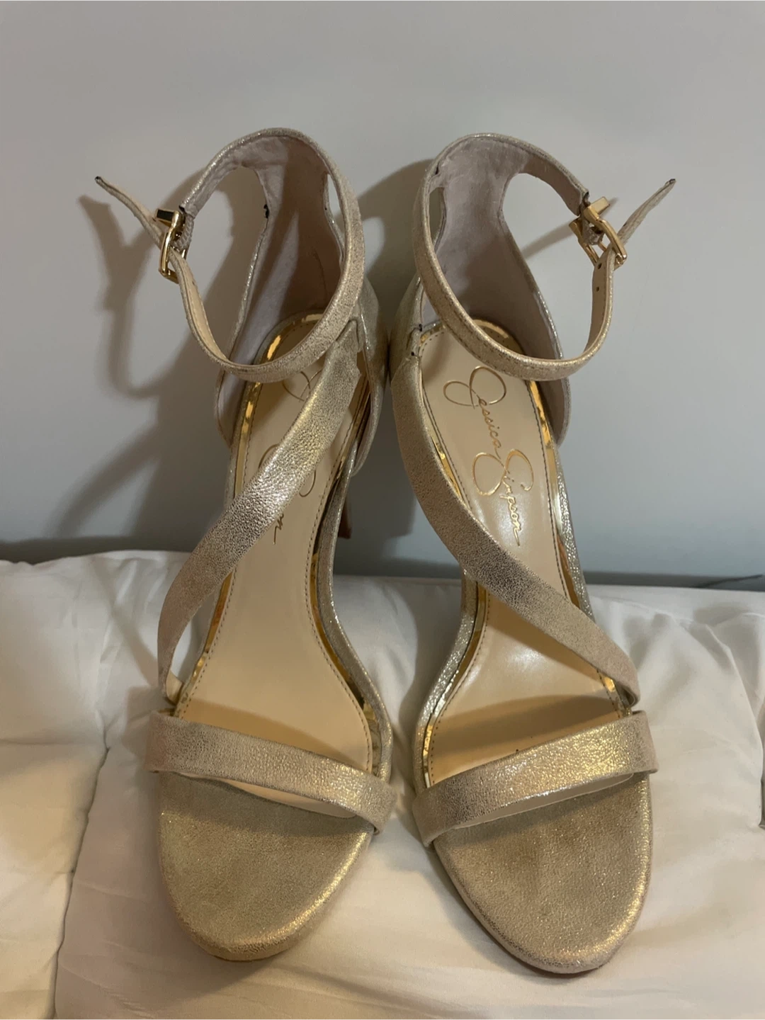 Selling a pair of Jessica Simpson gold heels in size 9.5. Only worn once. The heels have an ankle strap and a strap across the top of the foot for a secure fit. Love the design but the heel is too tall for me. Message me with any questions!