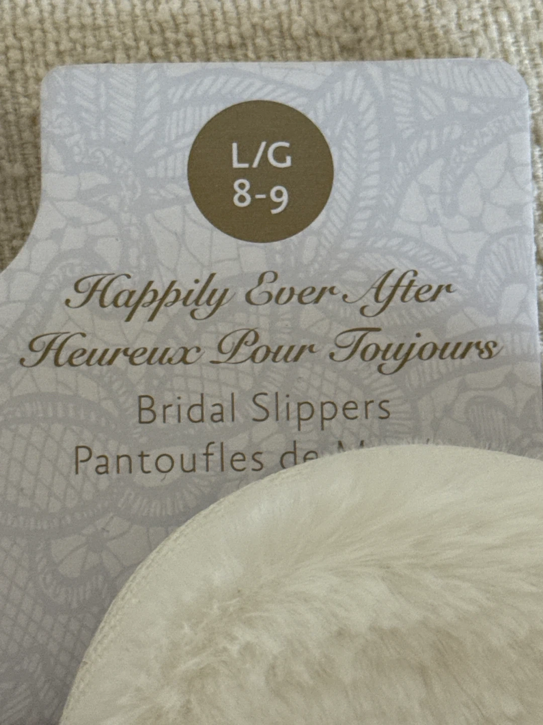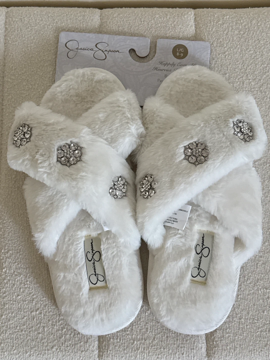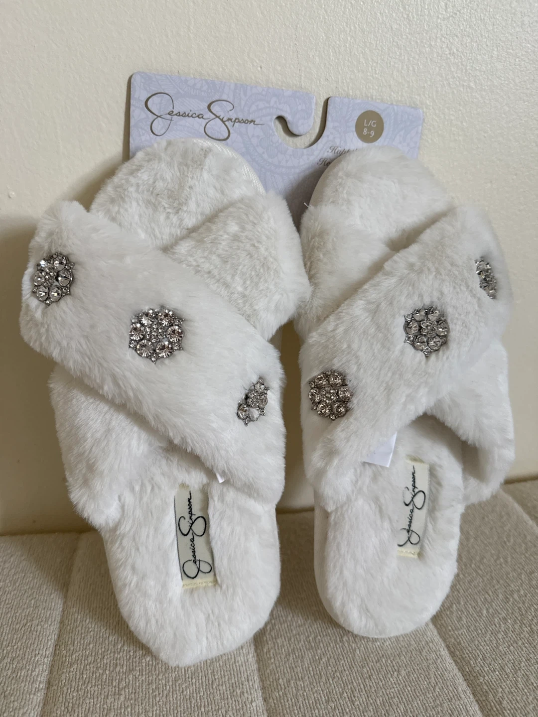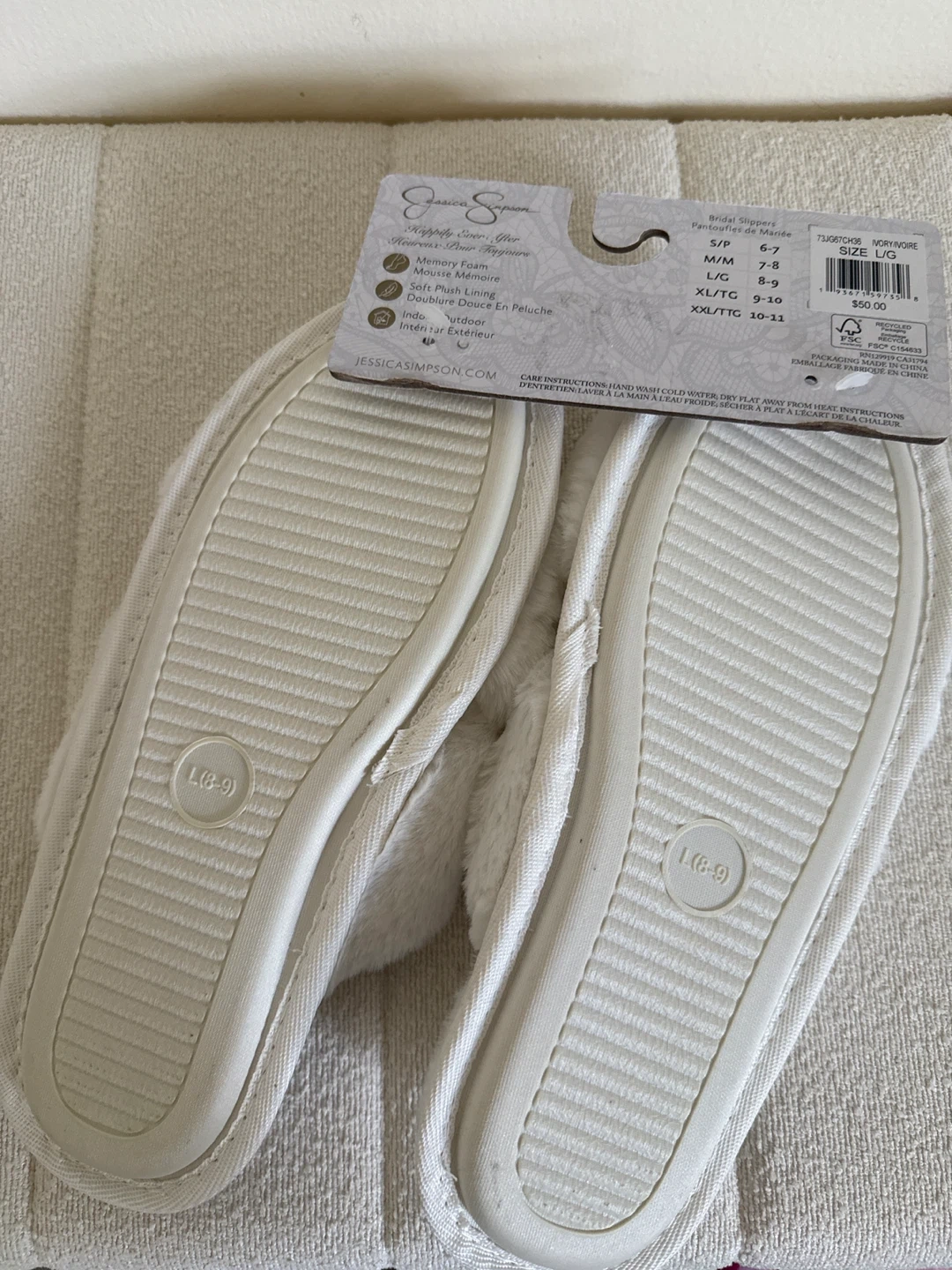 91Never worn, brand new condition!! These Jessica Simpson bridal slippers are brand new with tags! They're a size L/G, which fits sizes 8-9. They're a beautiful white colour and feature a lovely design. Originally bought for $50 Slippers Winter