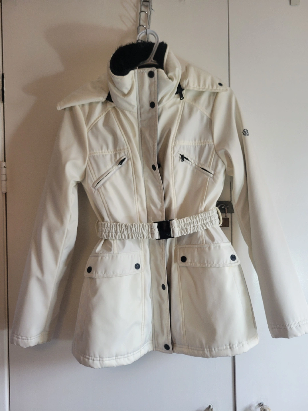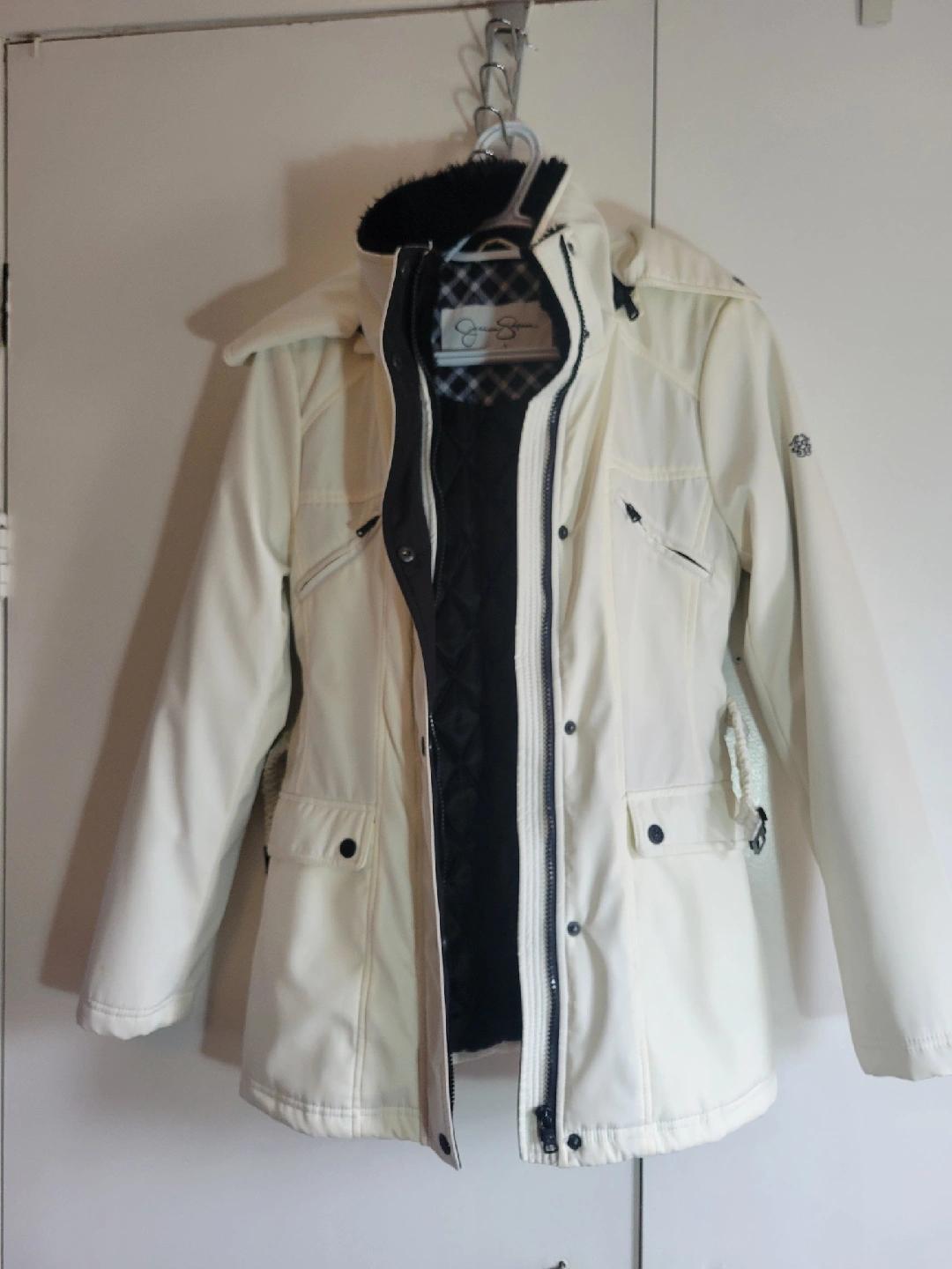 Selling a Jessica Simpson winter coat in a lovely white colour! It's in great shape and ready to keep you warm this winter. It features a stylish design with a hood and a belt. Has soft fur inside and perfect for those chilly Canadian days! Gently used. In great condition.