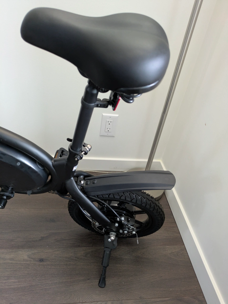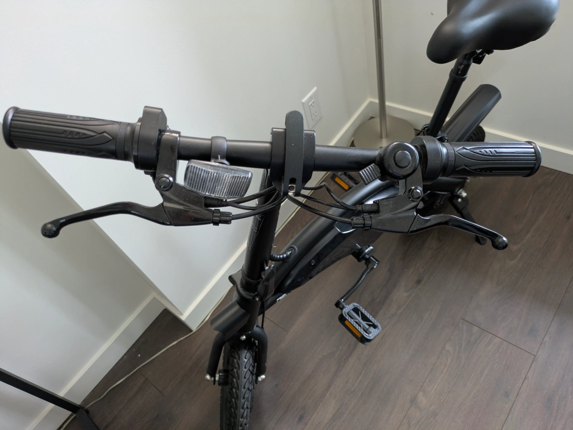 Black folding electric bike. Includes helmet. Good condition. Small and portable. Easy to store. Charger with small damage (easily replaced -15$ in Amazon) Pick-up around Burquitlam station only