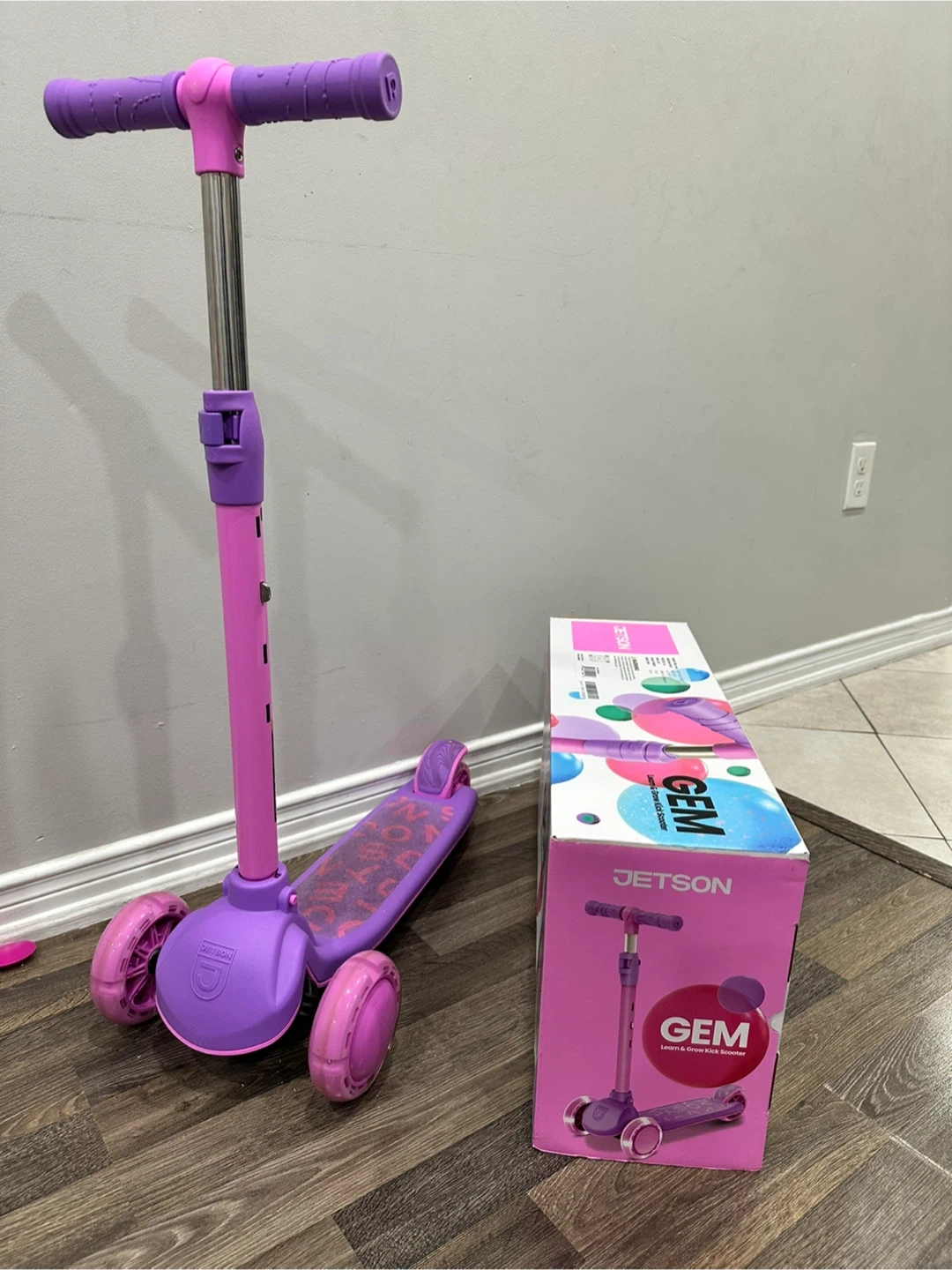 28Selling a Jetson Gem 3-wheel scooter in purple and pink! It's in great condition and comes with the original box. Perfect for little ones learning to scoot around