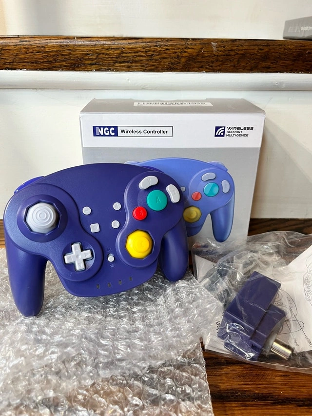 Relive your favorite GameCube games with this indigo NGC wireless controller! This controller is in new condition, offering a comfortable grip and responsive controls for a seamless gaming experience. It's ready to plug and play, letting you dive straight into your gaming adventures. * Wireless connectivity * Compatible with GameCube consoles and Wii consoles. * Ergonomic design for comfortable play * Includes receiver. Cash accepted. Cashless payment accepted.