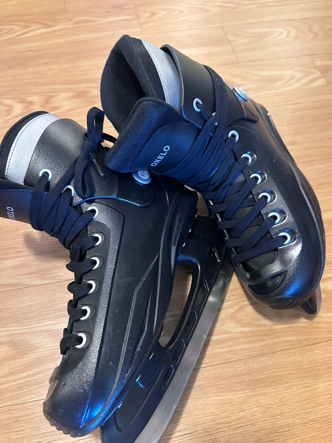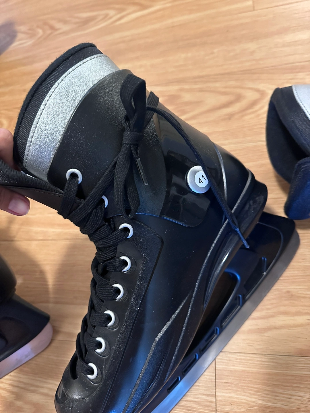 Black ice skates with a silver detail, like new, used twice. size 41 EU, as picture. Lace-up design with a silver button on the side. Includes the original tag. The skates are pre-owned.