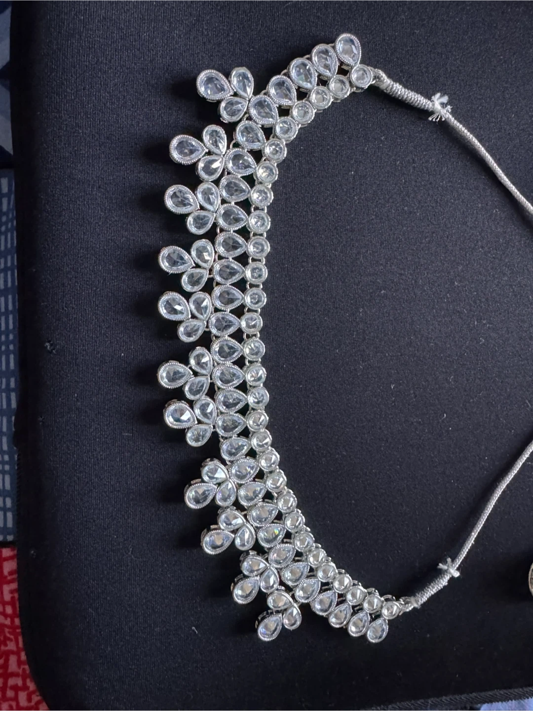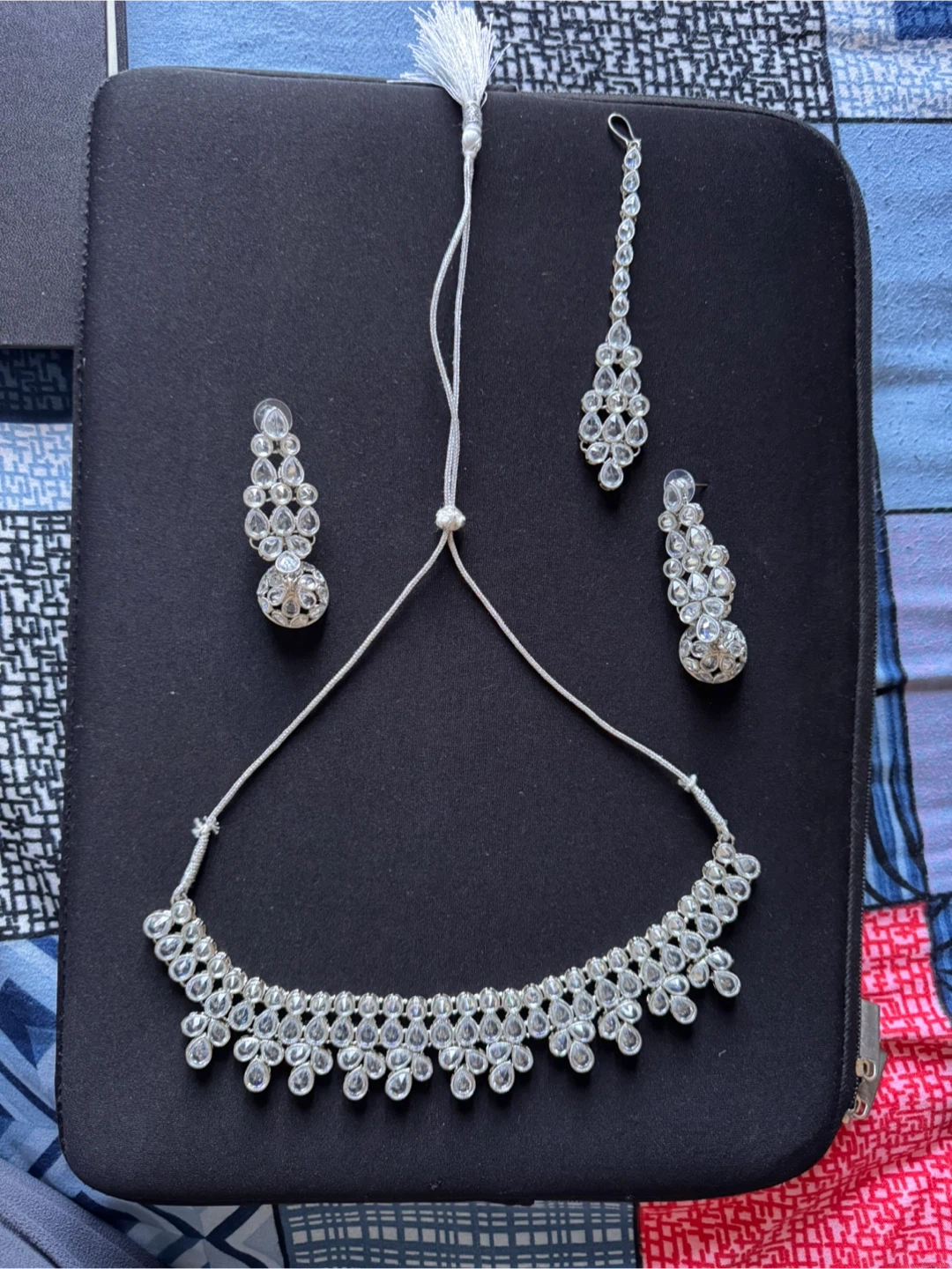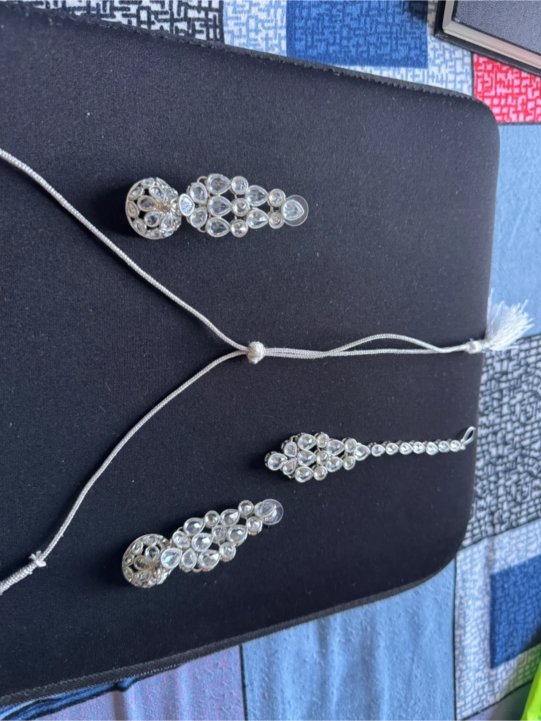 68Selling a beautiful jewellery set that includes a necklace, earrings, and tikka. The set features a delicate design with clear stones, perfect for adding a touch of elegance to any outfit. New- never used