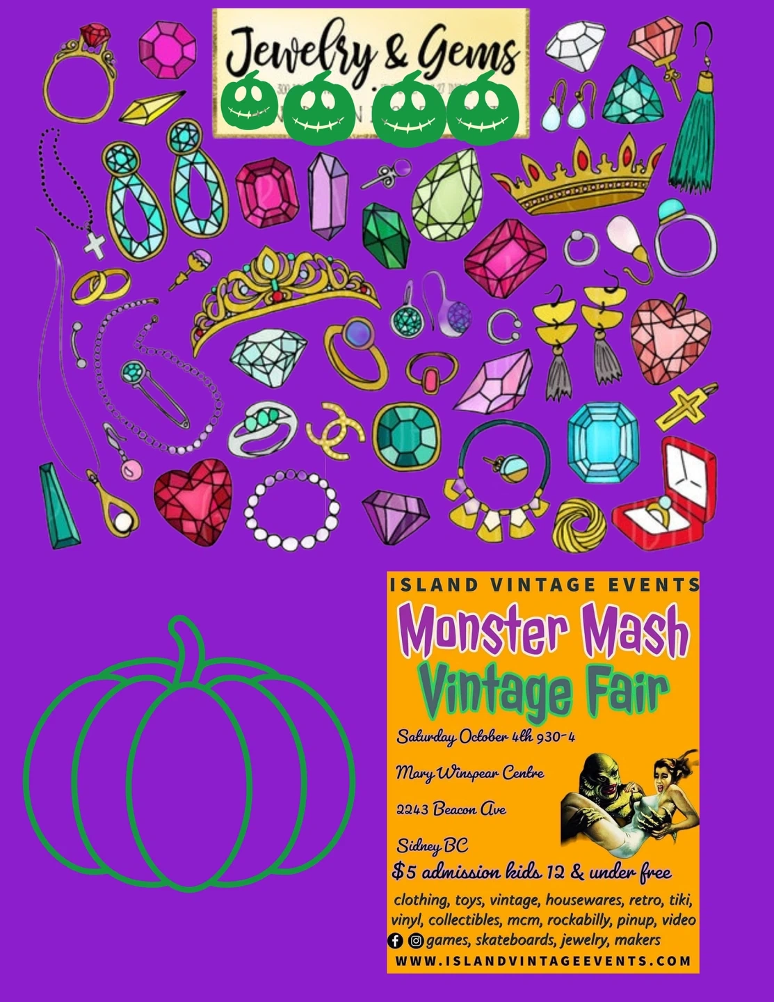 Jewelry and Gems for Sale Handmade and Vintage Jewelry and Gem stones will be for sale at our big event. Monster Mash Halloween Vintage Fair and more…. “Something for Everyone “ Mary Winspear Centre Saturday October 4th 2025 🦇🎃👻 930-4 $5 admission, kids 12 & under free with a adult admission. Admission door is at the side courtyard next to the parking lot. We encourage everyone to dress in costume to kick off the Halloween season. $5 admission Kids 12 & under free. 80 vendors please come support our small Canadian local businesses 🇨🇦 We are very excited to announce Superheroes of Victoria will be in attendance raising money for the BC Children’s Hospital Foundation (Photo Ops by donation) Superheroes of Victoria. Costume contest 12:00pm Sponsored by our friends at Lazy Susan’s Vintage Store 2039 Oak Bay Ave and the Funky Vintage Emporium S.P.C.A. store on 7167 West Saanich Rd Food Trucks Mary Winspear Centre 2243 Beacon Ave Sidney BC Canada Mary Winspear Centre Vintage, Rockabilly, Tiki, Pin up, Automotive, MCM, Atomic Era, Retro, Clothing, Toys, Skateboards, Video Games, Housewares, Makers, Artist, Crafts, Pop Culture, Vinyl, music, food. Please visit our website at www.islandvintageevents.com #yyj #yyjmarkets #yyjevents #makersmarket #vintagefair #toyfair #vintage #retro #rockabilly #pinup #atomicera #mcm #midcenturymodern #Tiki #popculture #vintageclothing #sidneybc #vancouverisland #victoriabc #vivavictoria #surf #islandvintageevents #art #crafts #vinyl #skateboards #videogames #automotive #hotrod