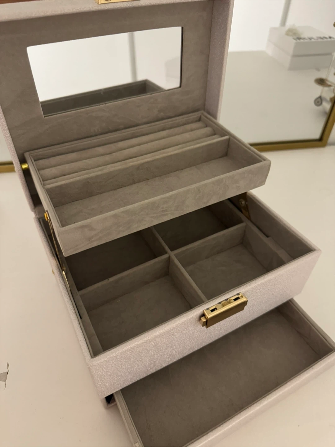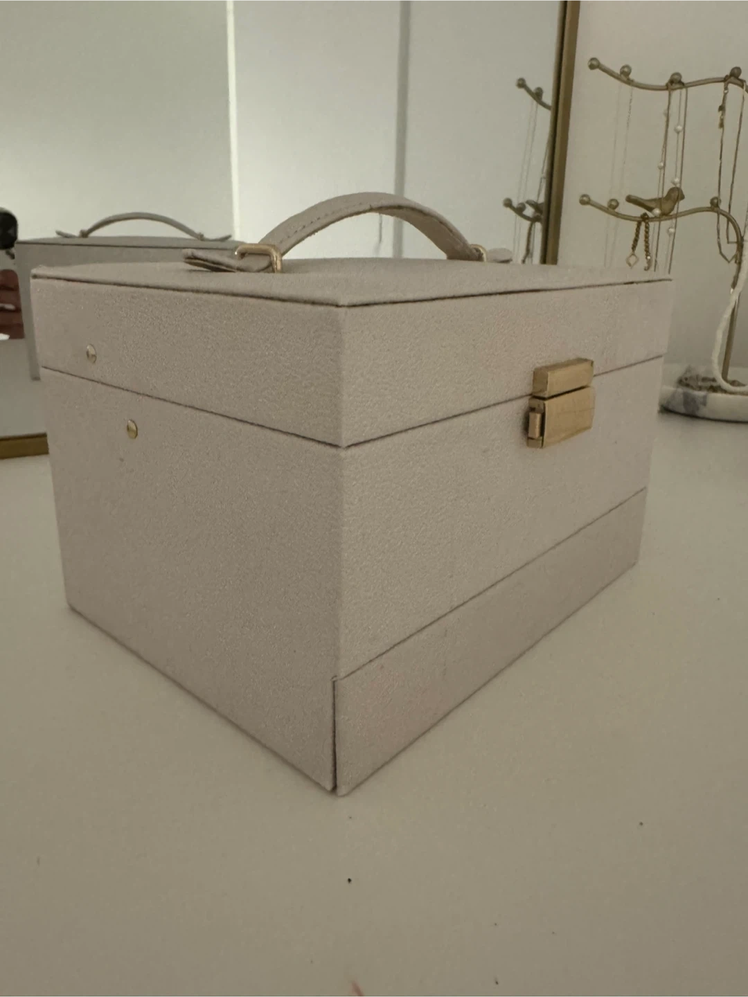 5Selling a beige jewelry box in great condition! It features multiple compartments and a mirror, perfect for organizing your favourite pieces. It's a stylish and practical addition to any dresser or vanity