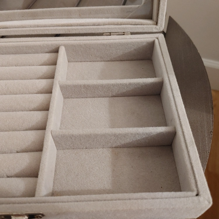 68Selling a jewelry box! It's in good condition and ready to keep your jewellery organized. It has a glass top and soft, grey velvet interior
