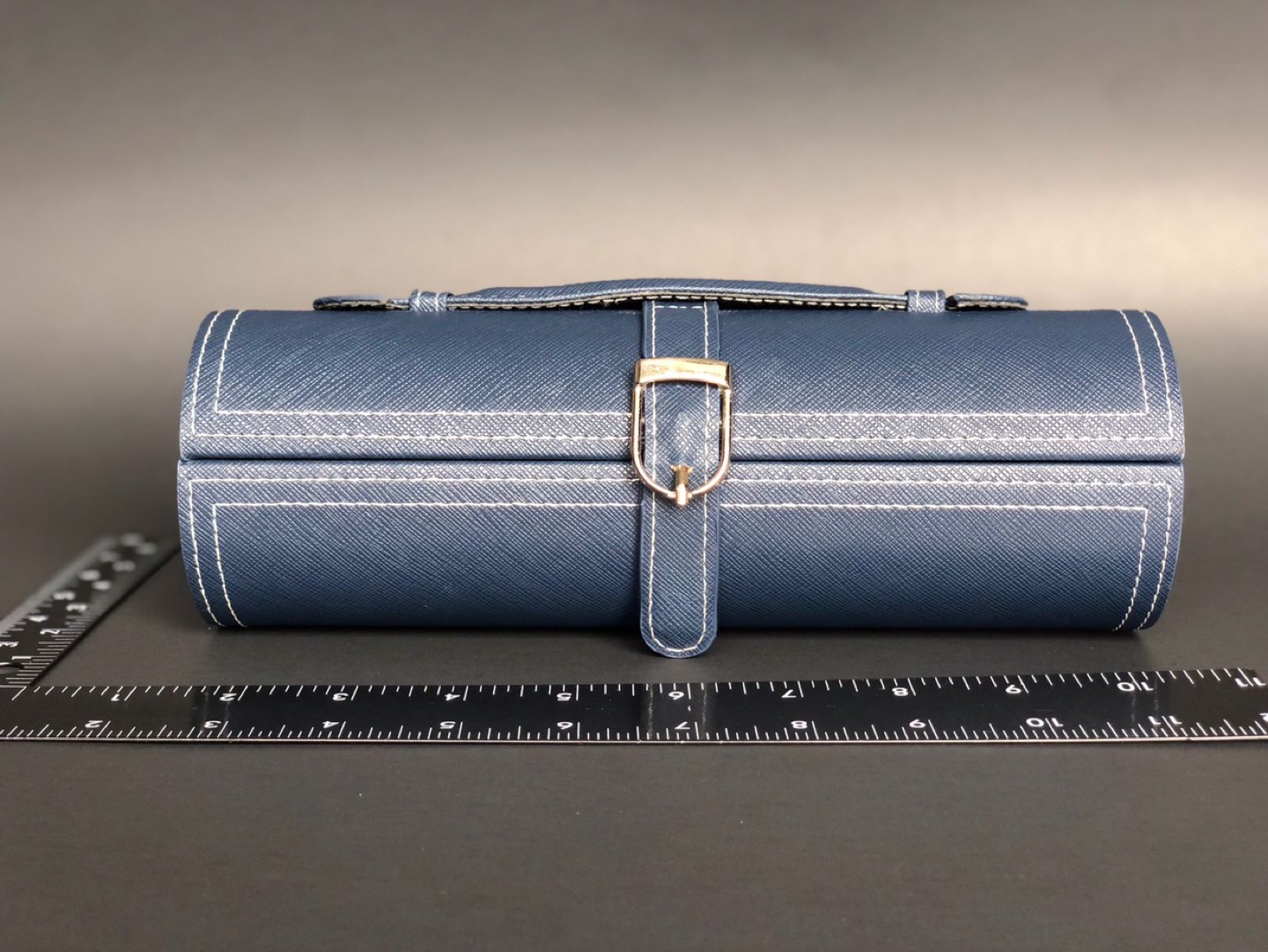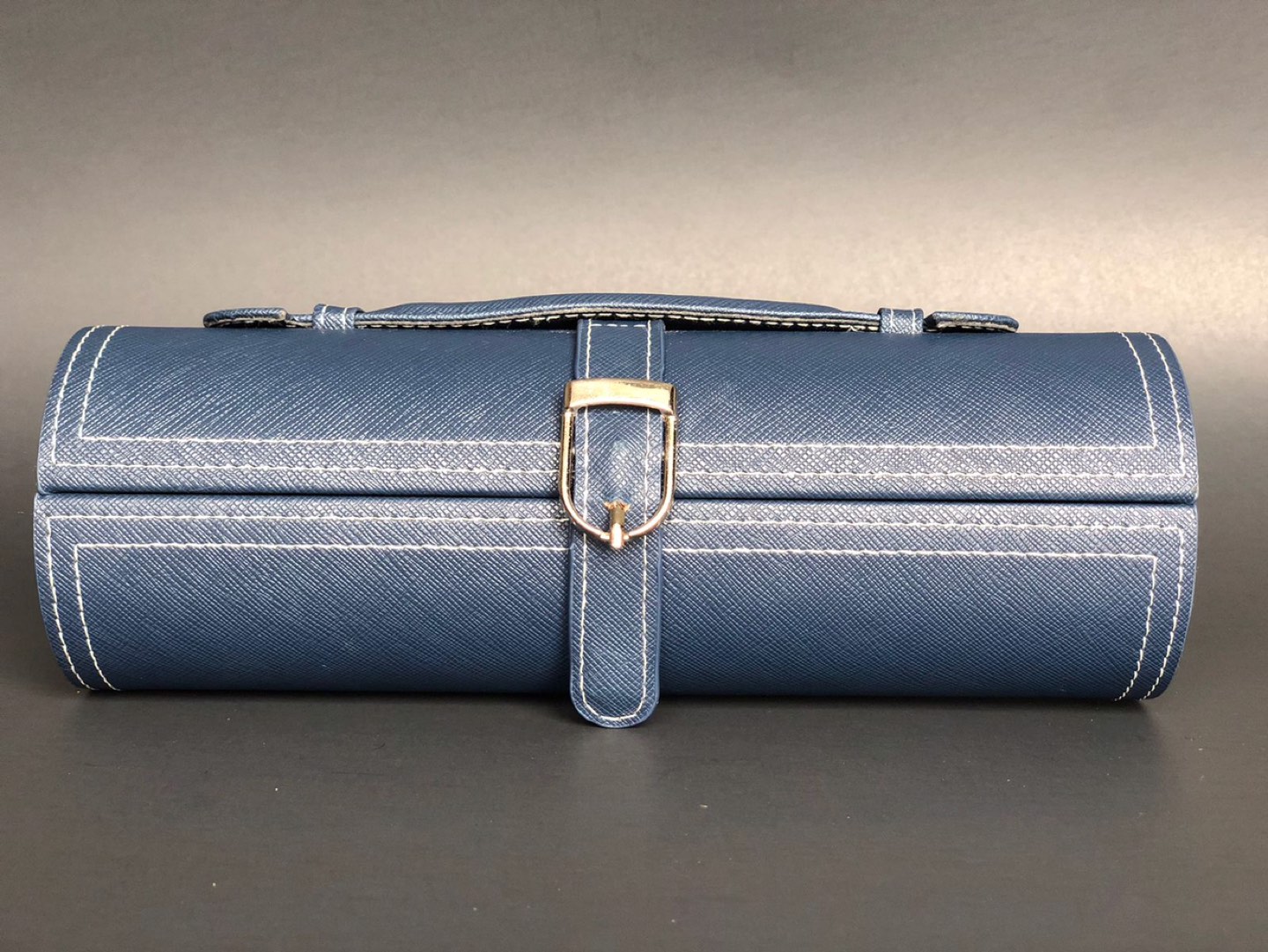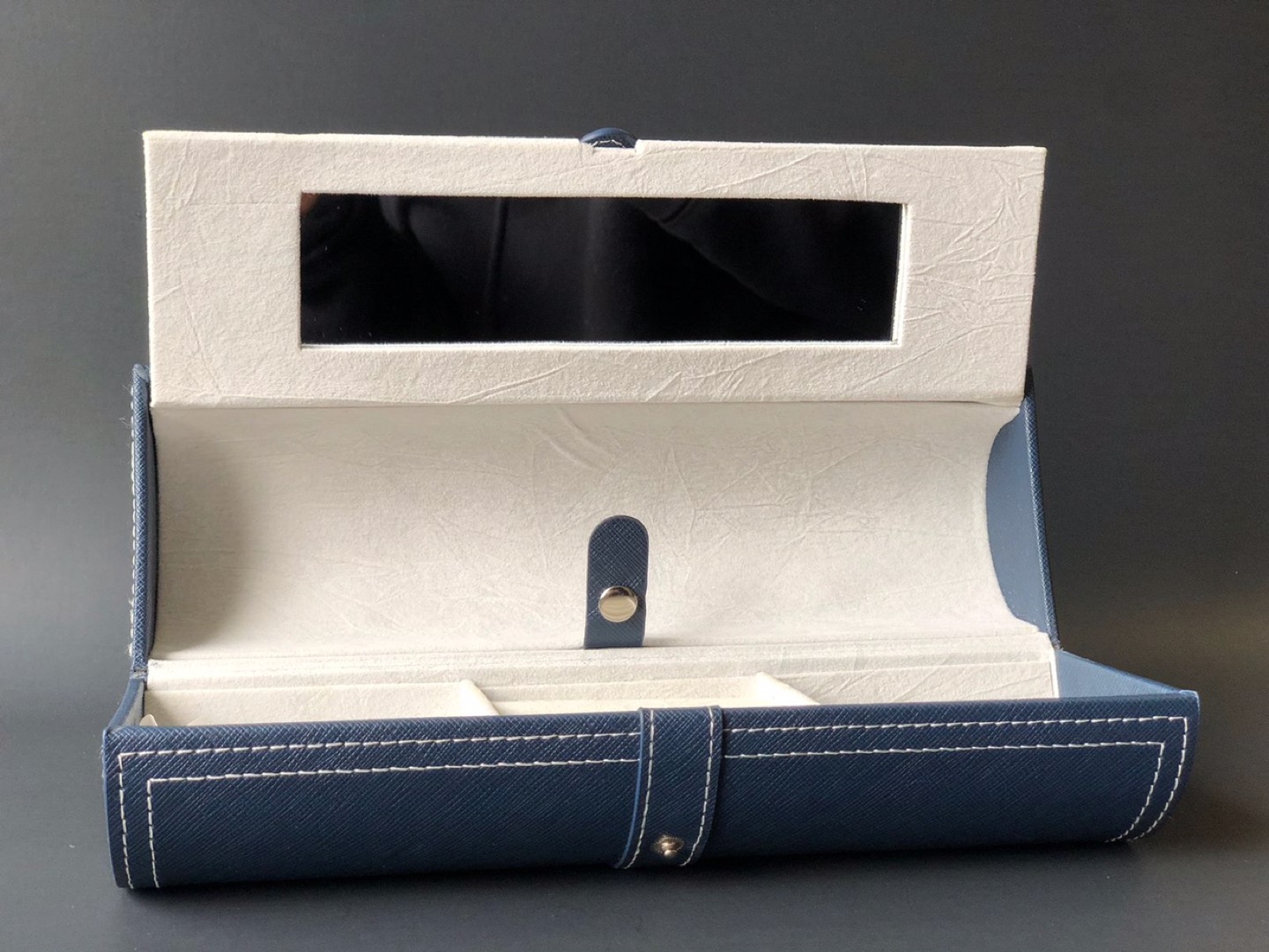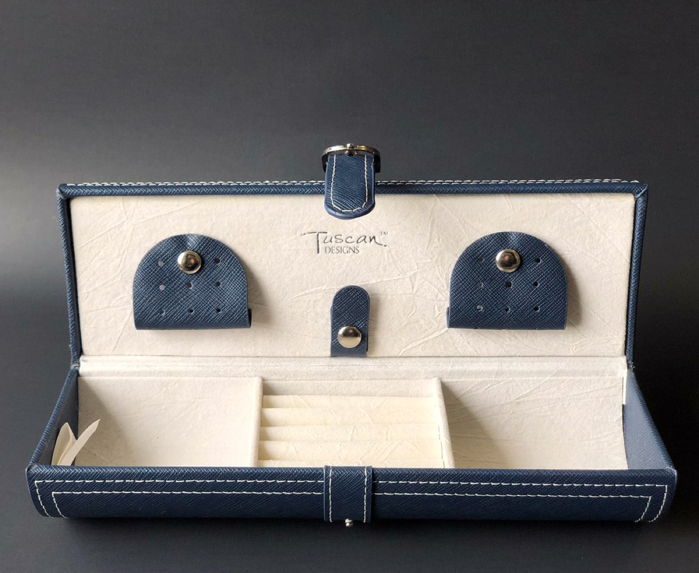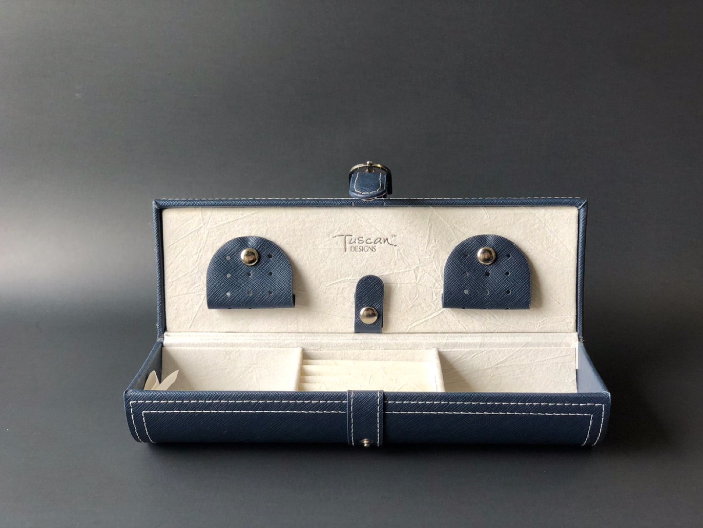 252JEWELRY BOX PURSE Tuscan Designs Brand Vintage Textured Faux Leather Cylinder Home Travel Mirror case Has a cream beige color interior with ring rolls 24 cm x 9 cm