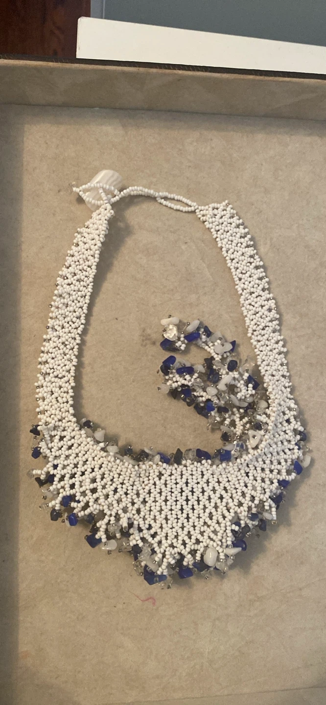 Very distinct blue beaded set. Has matching earrings. $20!/ set