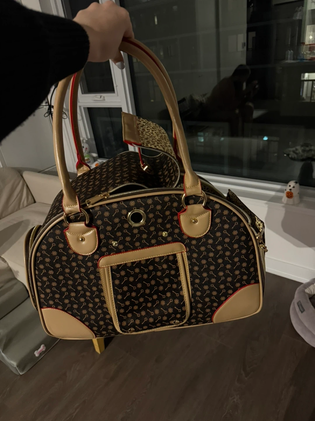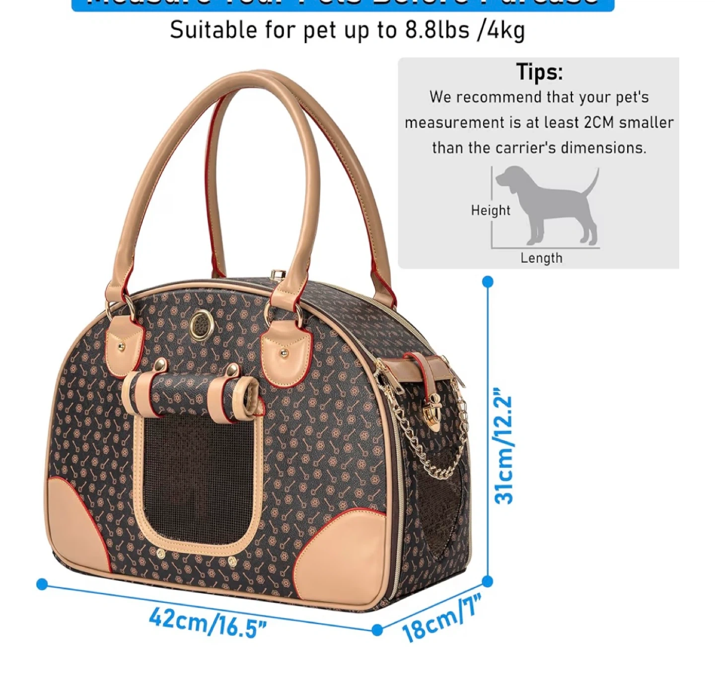 This pet carrier is perfect for travel! It's suitable for pets up to 8.8lbs/4kg. The dimensions are 42cm/16.5" (length), 31cm/12.2" (height), and 18cm/7" (width)