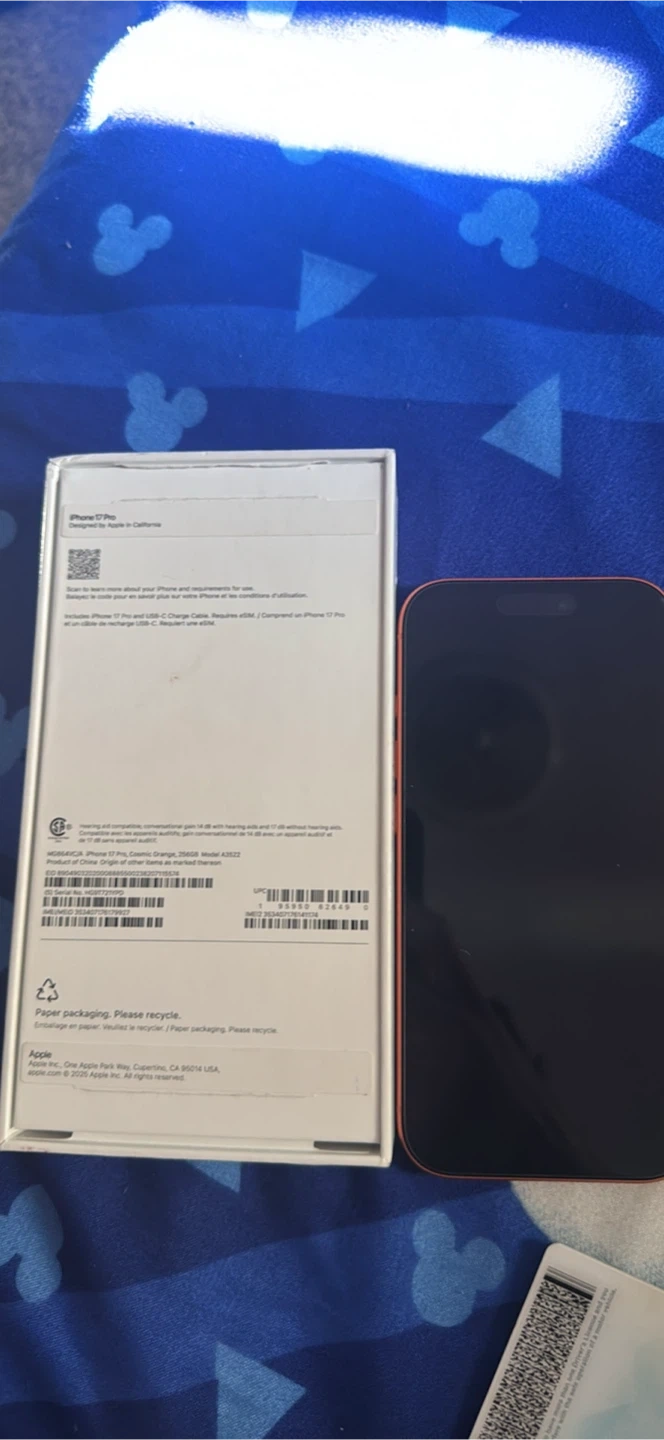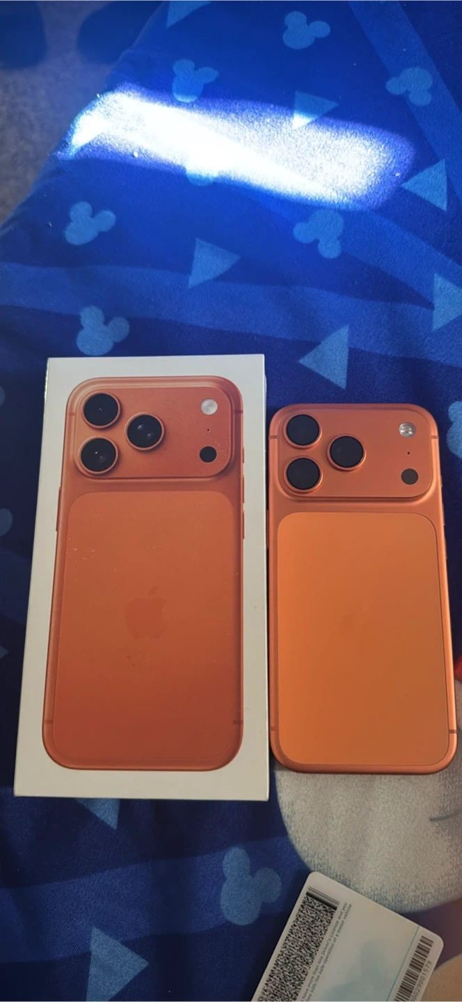 This is an Apple iPhone 17 Pro in orange. The maximum battery capacity is 100% with a cycle count of 19. It was manufactured in November 2025 and first used in January 2026. Includes original packaging.