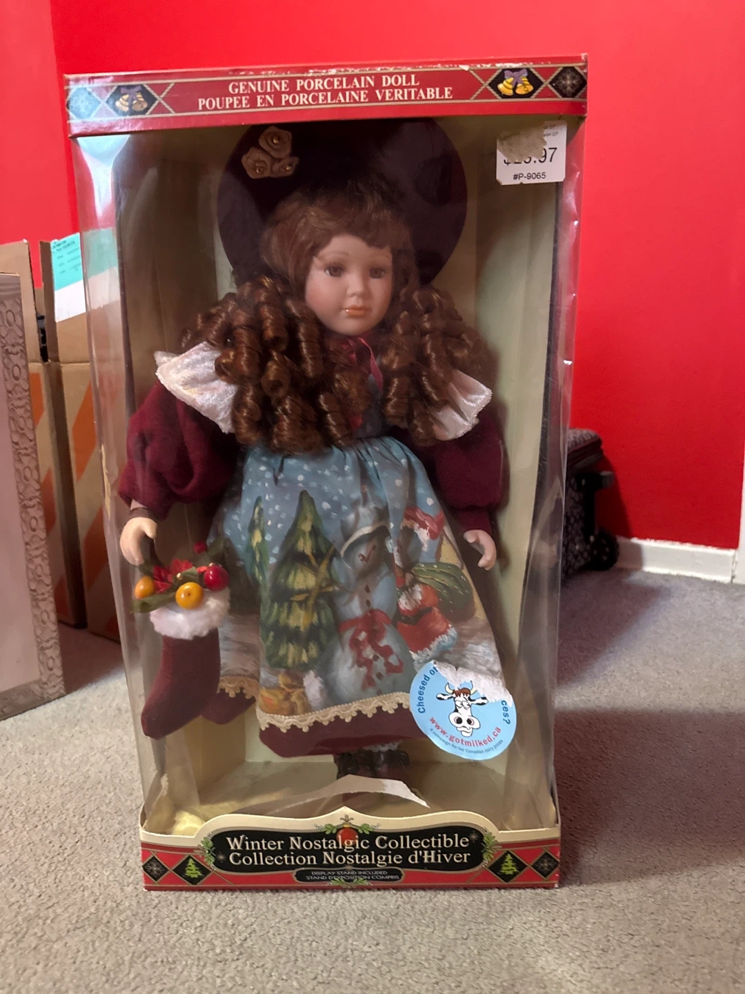 Genuine porcelain doll in winter attire. It's part of the 'Winter Nostalgic Collectible' collection. Doll includes a small stocking accessory with fruit. Display stand is included.