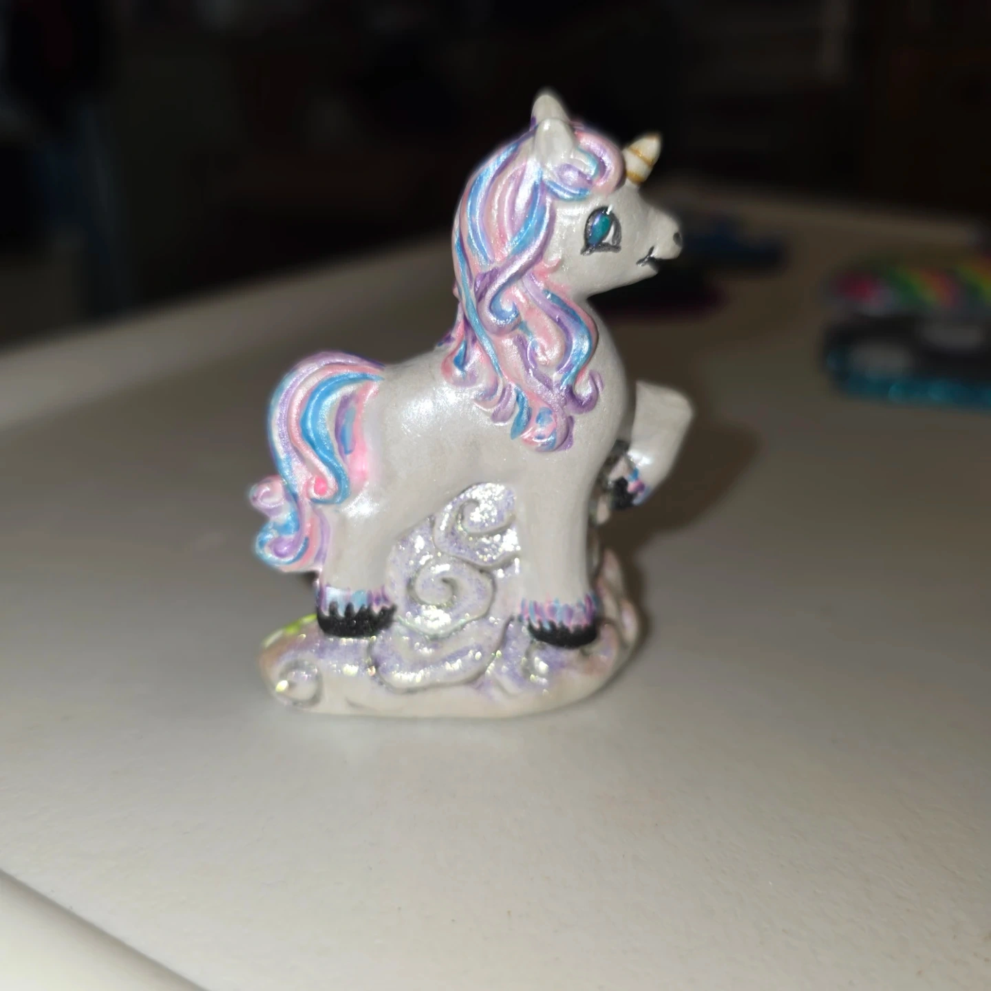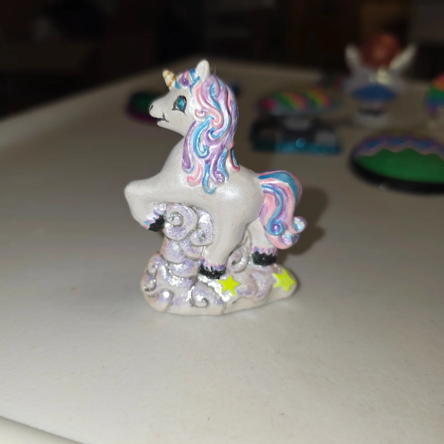 This is a cute, hand-painted unicorn figurine standing on a cloud base. It has a white body with colourful mane and tail accents in pink, blue, and purple. The base is also decorated with glittery swirls and some yellow stars. It's a lovely decorative piece!