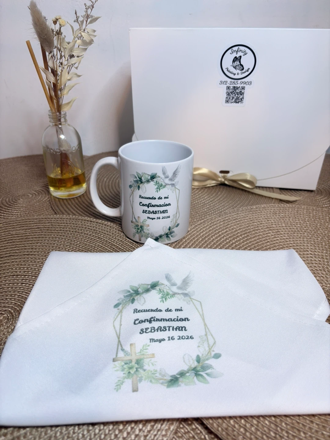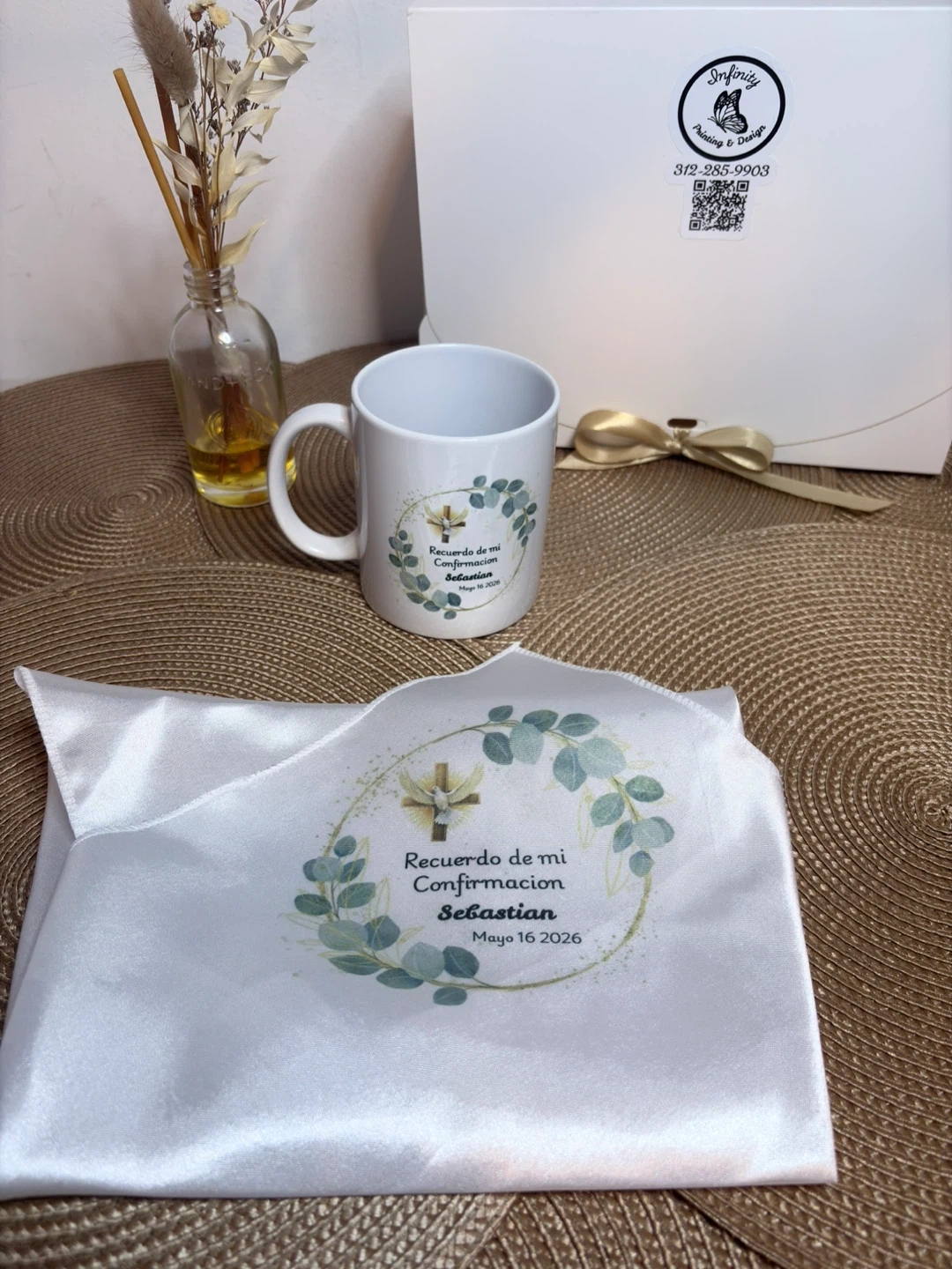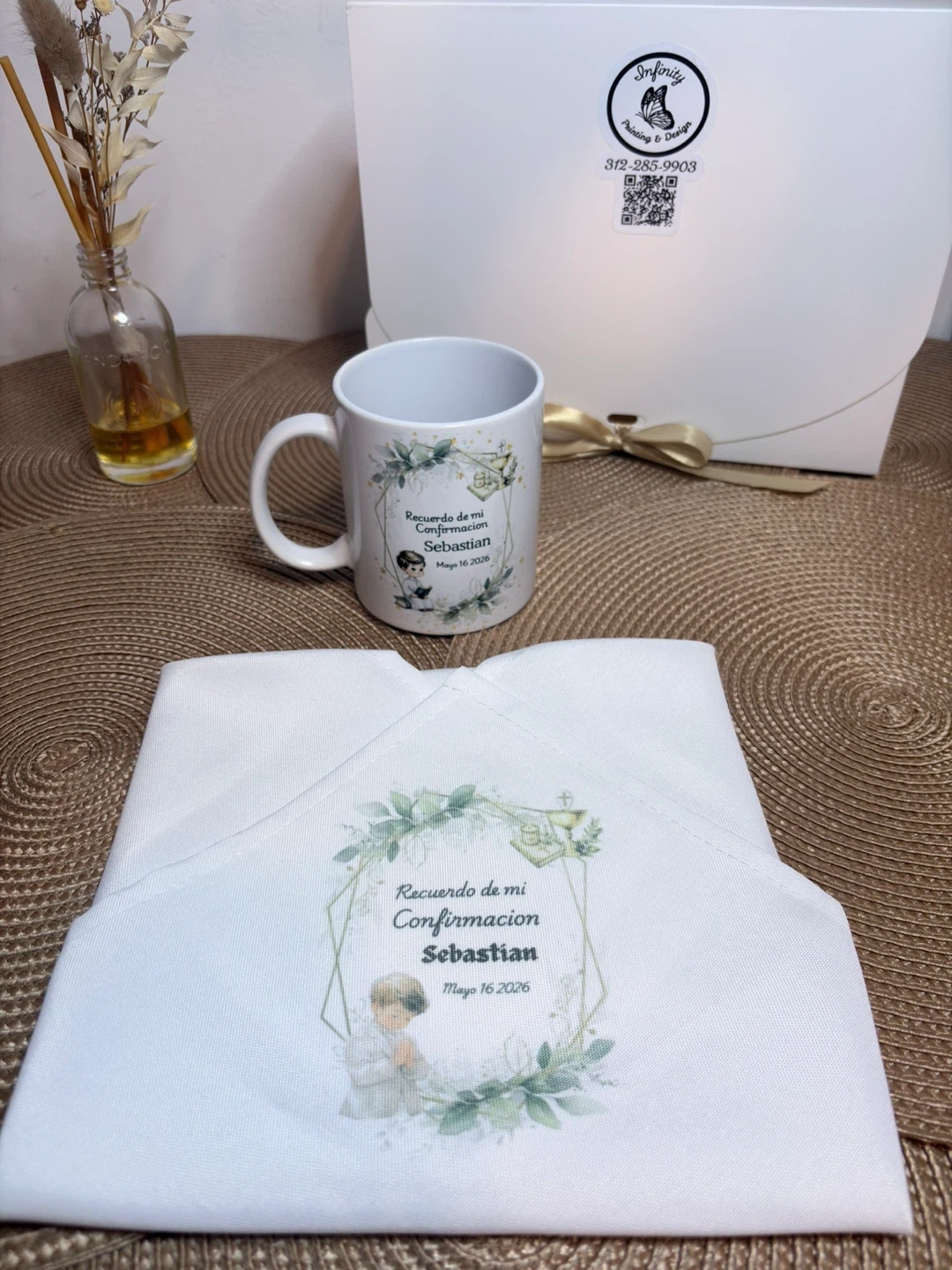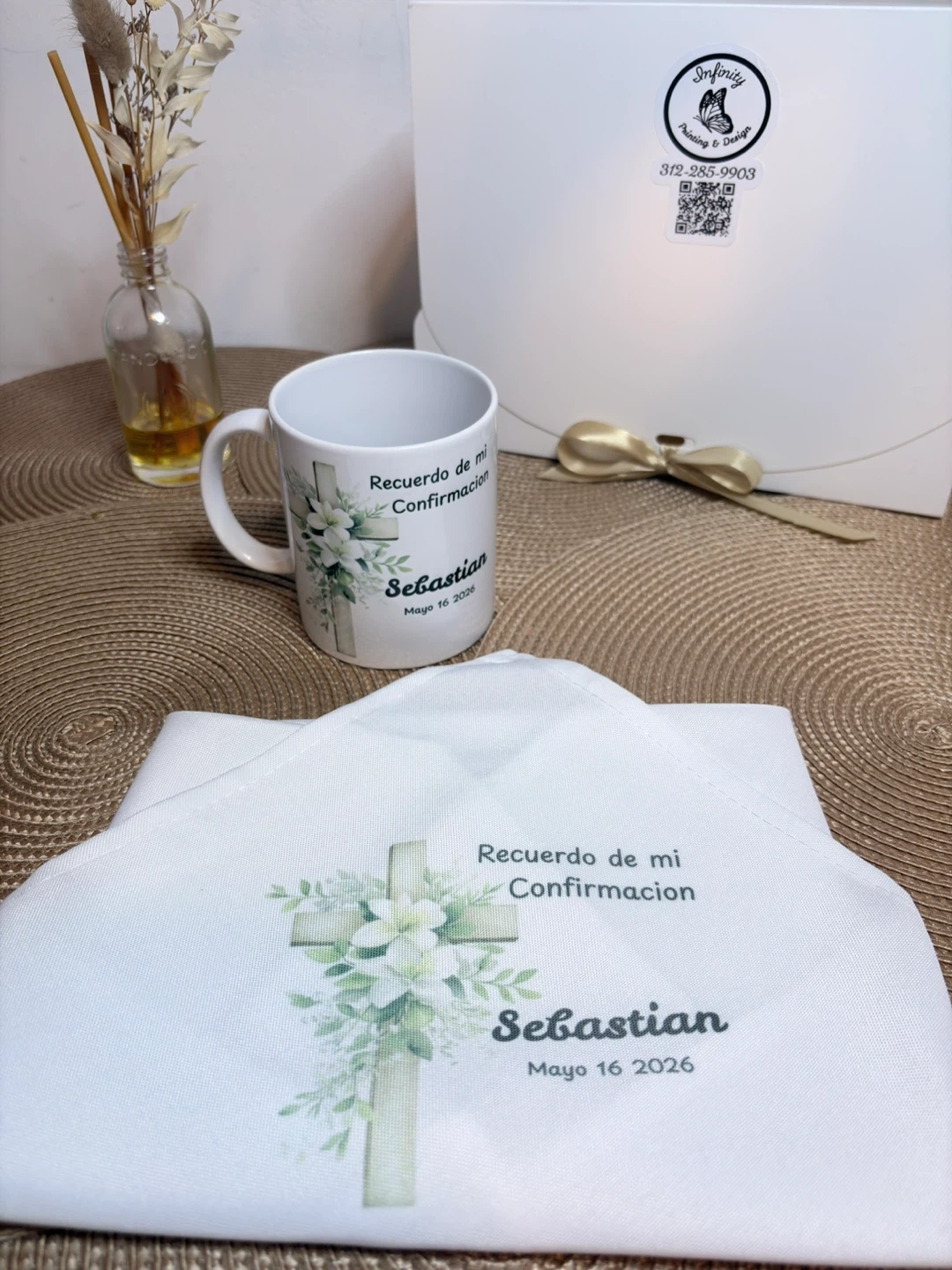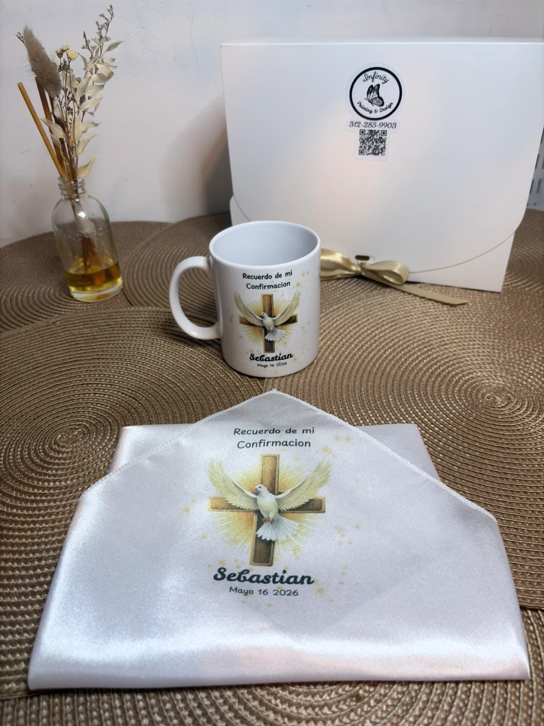 This set includes a mug and a cloth, both personalized with 'Recuerdo de mi Confirmacion Sebastian' and the date 'Mayo 16 2026'. The mug features a dove and cross design, while the cloth has various religious motifs. It comes in a decorative white box with a gold ribbon, ideal for a keepsake.