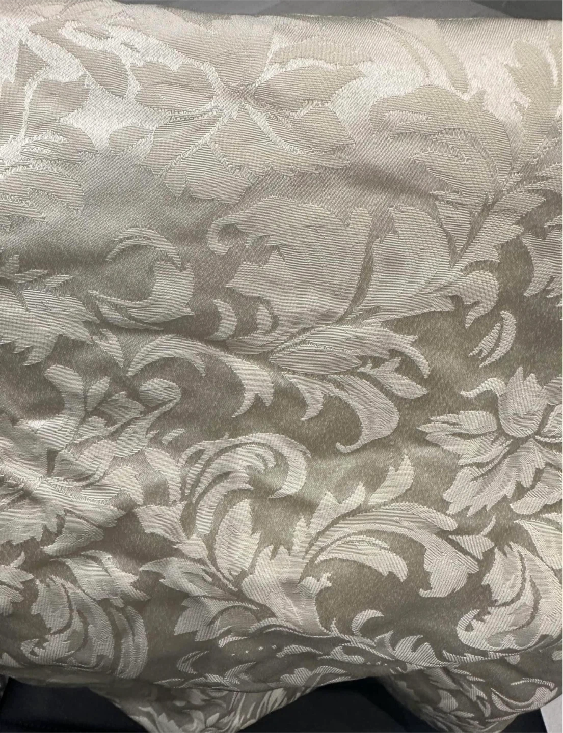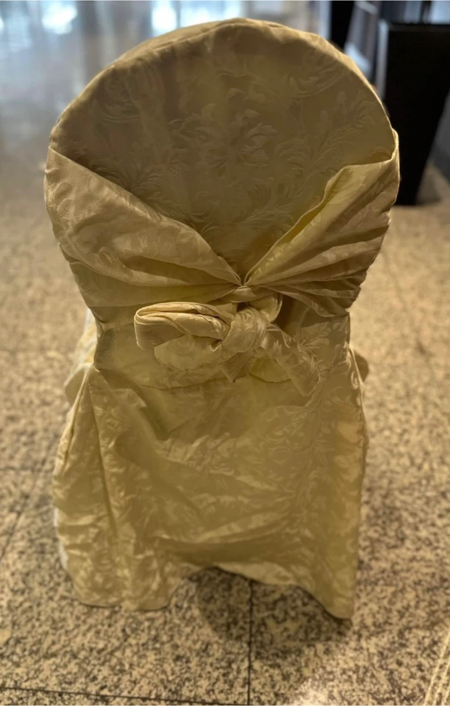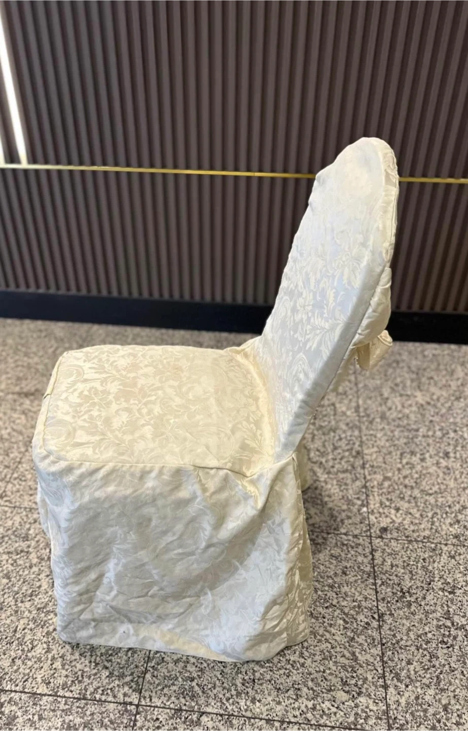 Add a touch of elegance to your event with these ivory chair covers, designed to fit standard banquet chairs. These chair covers are in used condition. They feature a subtle floral pattern that adds a sophisticated and timeless look to any setting. Perfect for weddings, parties, or corporate events, they will transform ordinary chairs into stylish seating.