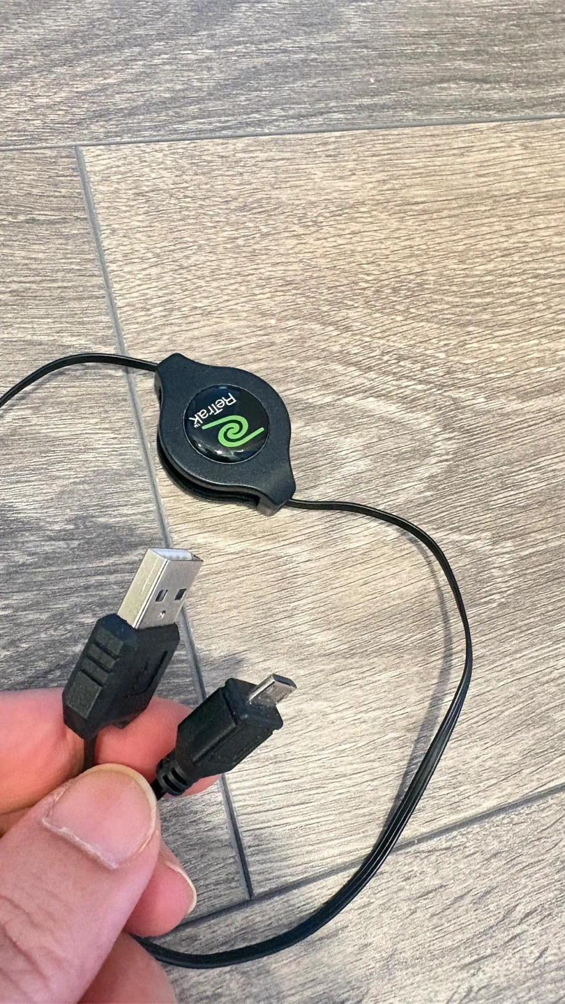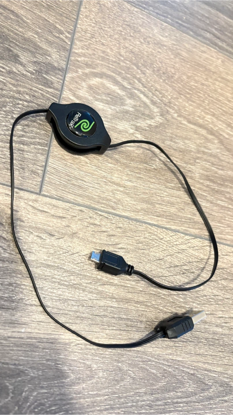 Retrak retractable cable with a USB-A connector on one end and a Micro-USB connector on the other. It's great for charging or data transfer. Keep your cables tidy!