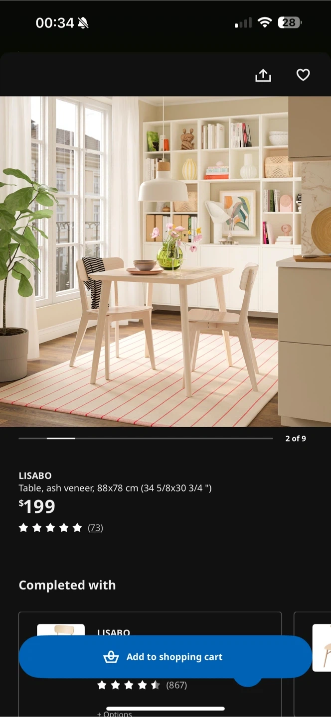 LISABO table with ash veneer construction. Measures 88x78 cm (34 5/8x30 3/4 "). It's a light wood finish. This table is suitable for dining or as a workspace.