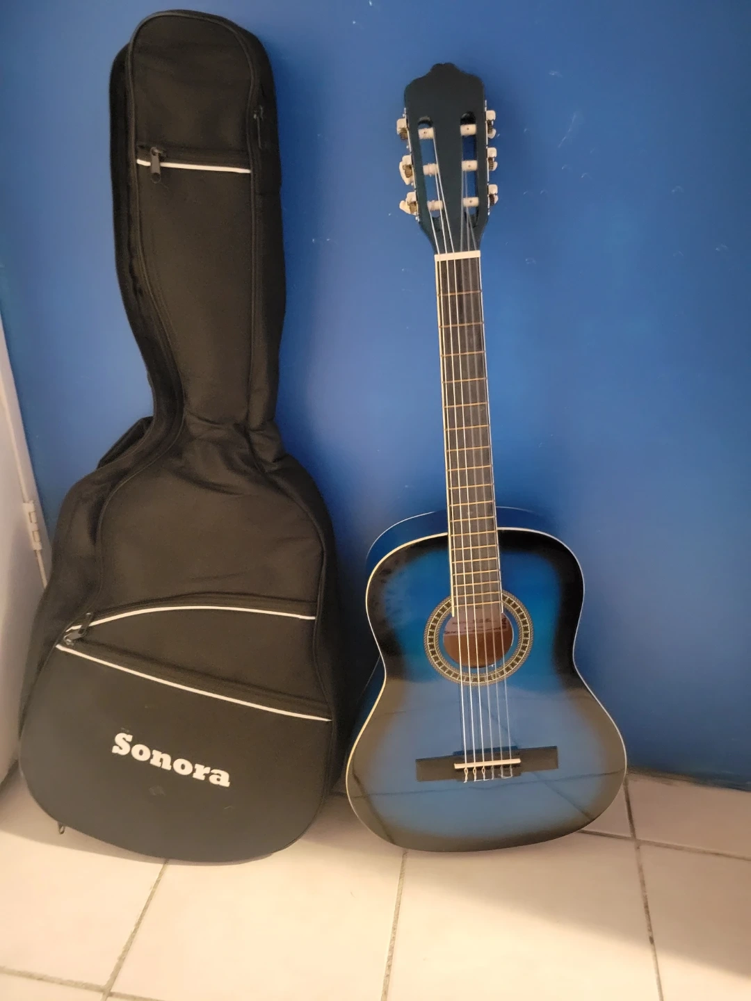 Selling a blue Sonora acoustic guitar. It comes with a case for easy transport and storage. Great for beginners or anyone looking for a reliable instrument!