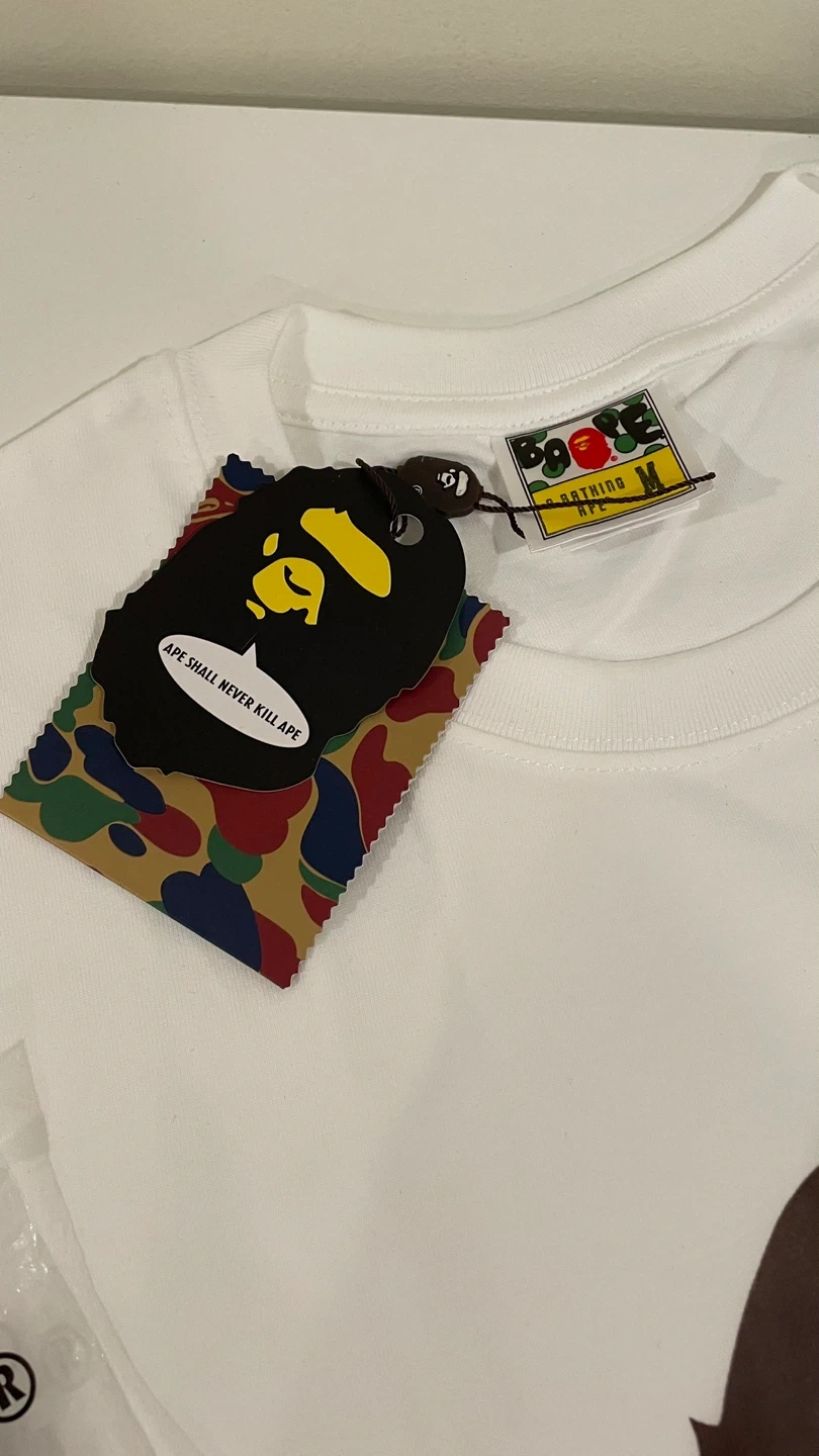 This is a white A Bathing Ape t-shirt featuring the iconic Big Ape Head graphic in brown and yellow. It's a size medium and comes in its original packaging with tags. Cotton material.